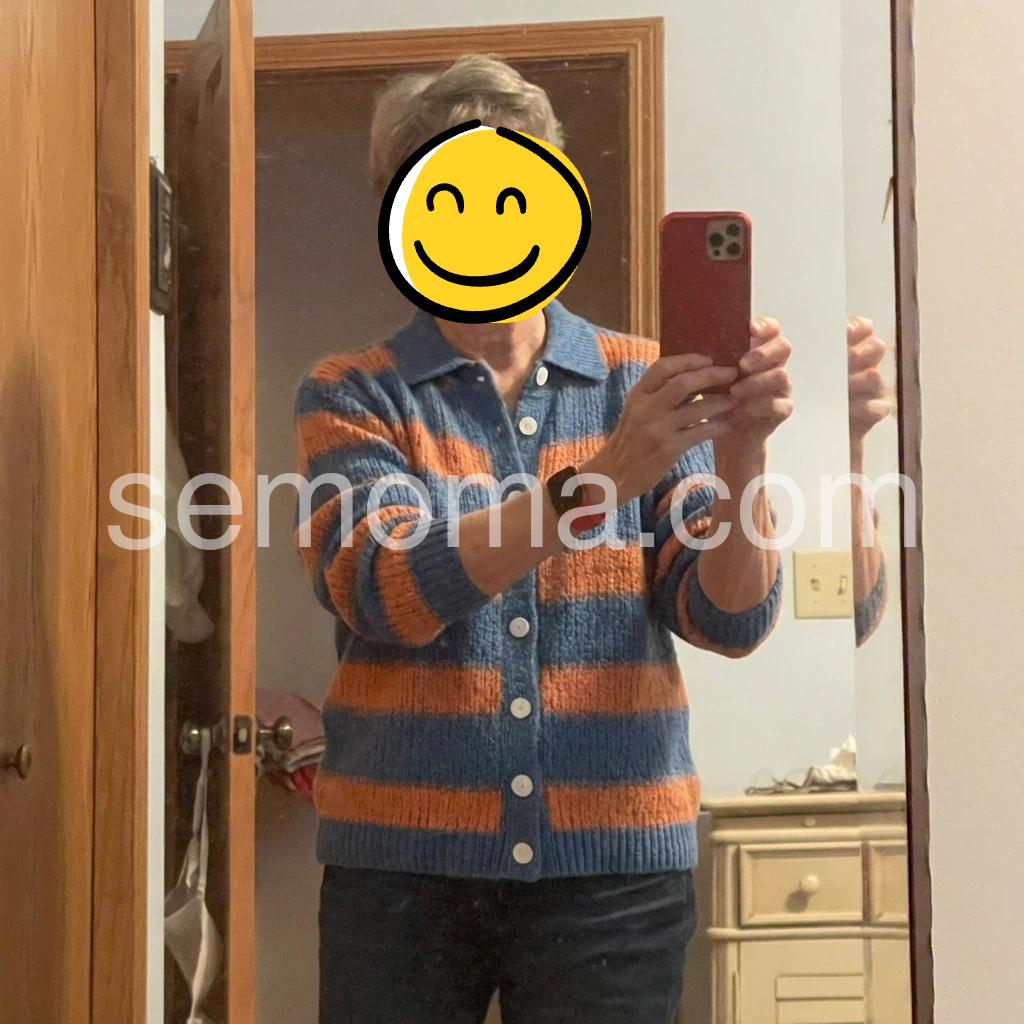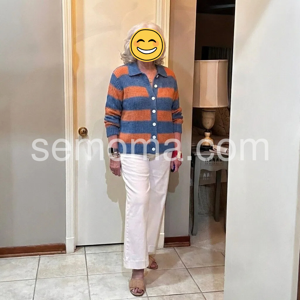 This cardigan is such a comfortable fit for everyday outings during the changing seasons. The blue and orange horizontal stripes look nice in person, and the collar frames my face really well. I can button it up without feeling tight or bulky, which is exactly what I wanted for daily wear.
