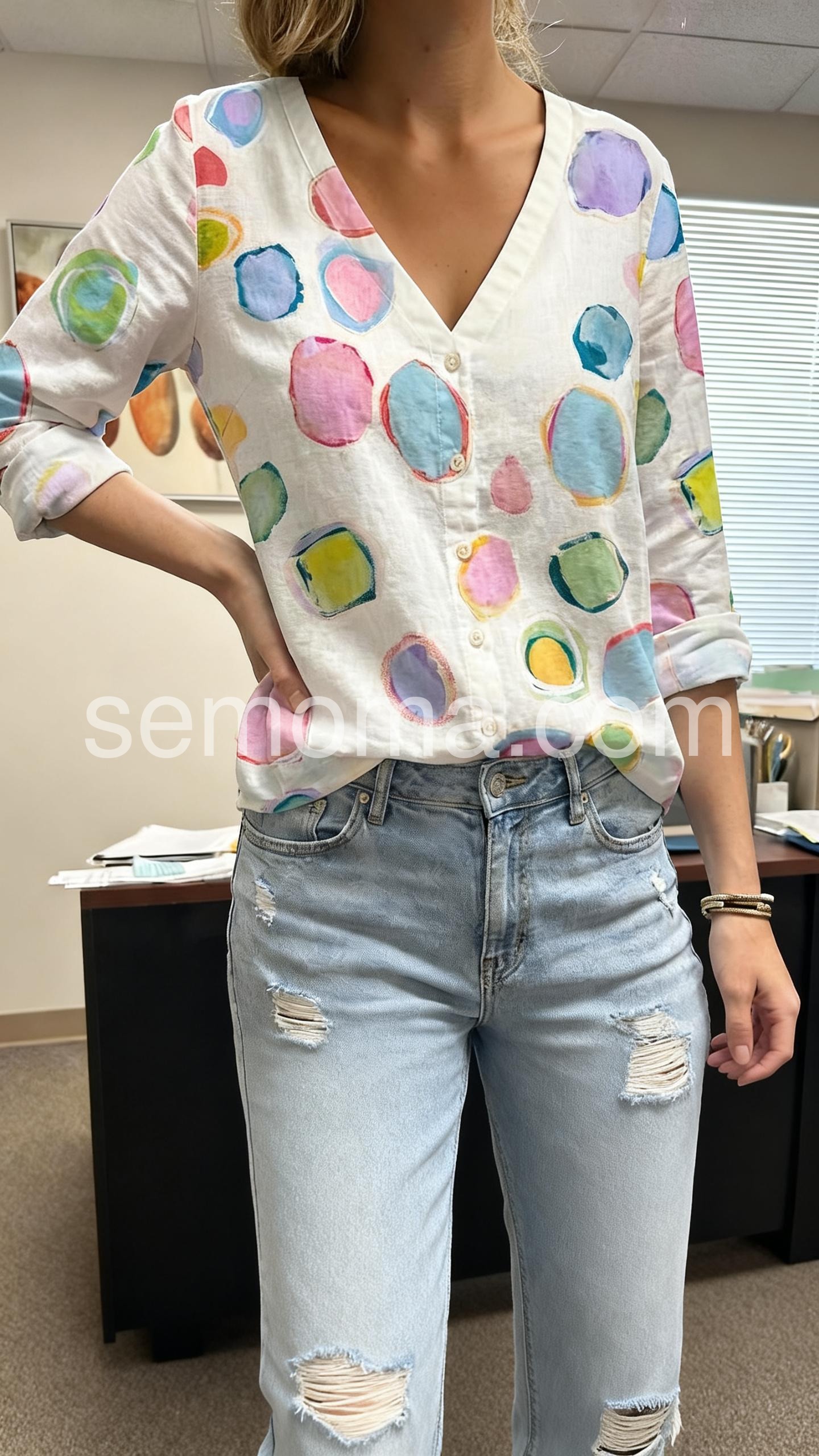 This blouse features a vibrant watercolor-style polka dot print on a soft white base. The relaxed fit and button-down front add casual charm. Rolled sleeves and side pockets enhance comfort. Perfect for pairing with jeans or shorts. Ideal for spring and summer days.