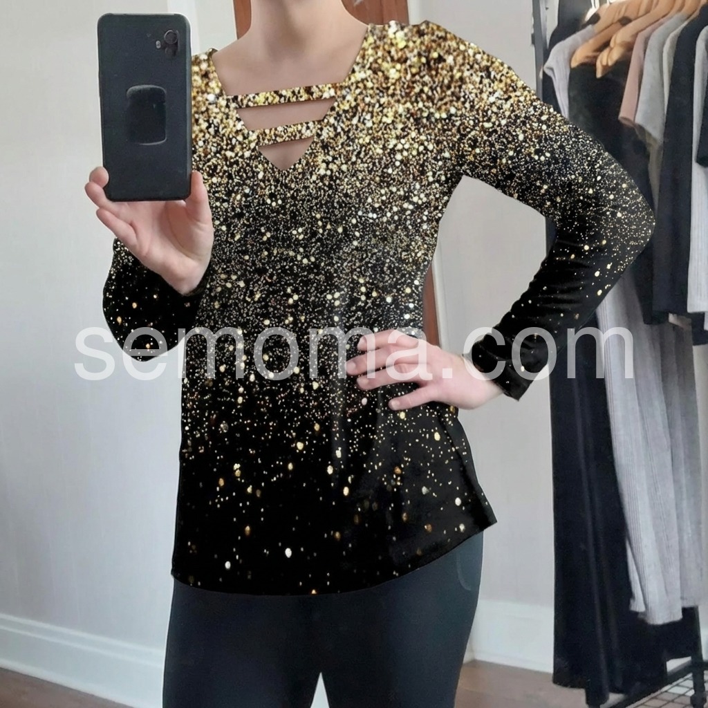 Just in time for your next glam holiday vacay! This sultry, strappy caged shirt has a v-neckline that awaits your favorite layering necklaces or statement jewels. This unique long-sleeved top sparkles with a generous sprinkle of metallic ombre silver and gold print, perfect for pairing with jeans or black slacks, boots, and metallic heels. Machine wash cold tumble dry low to medium heat. Iron if needed or lay flat to dry.