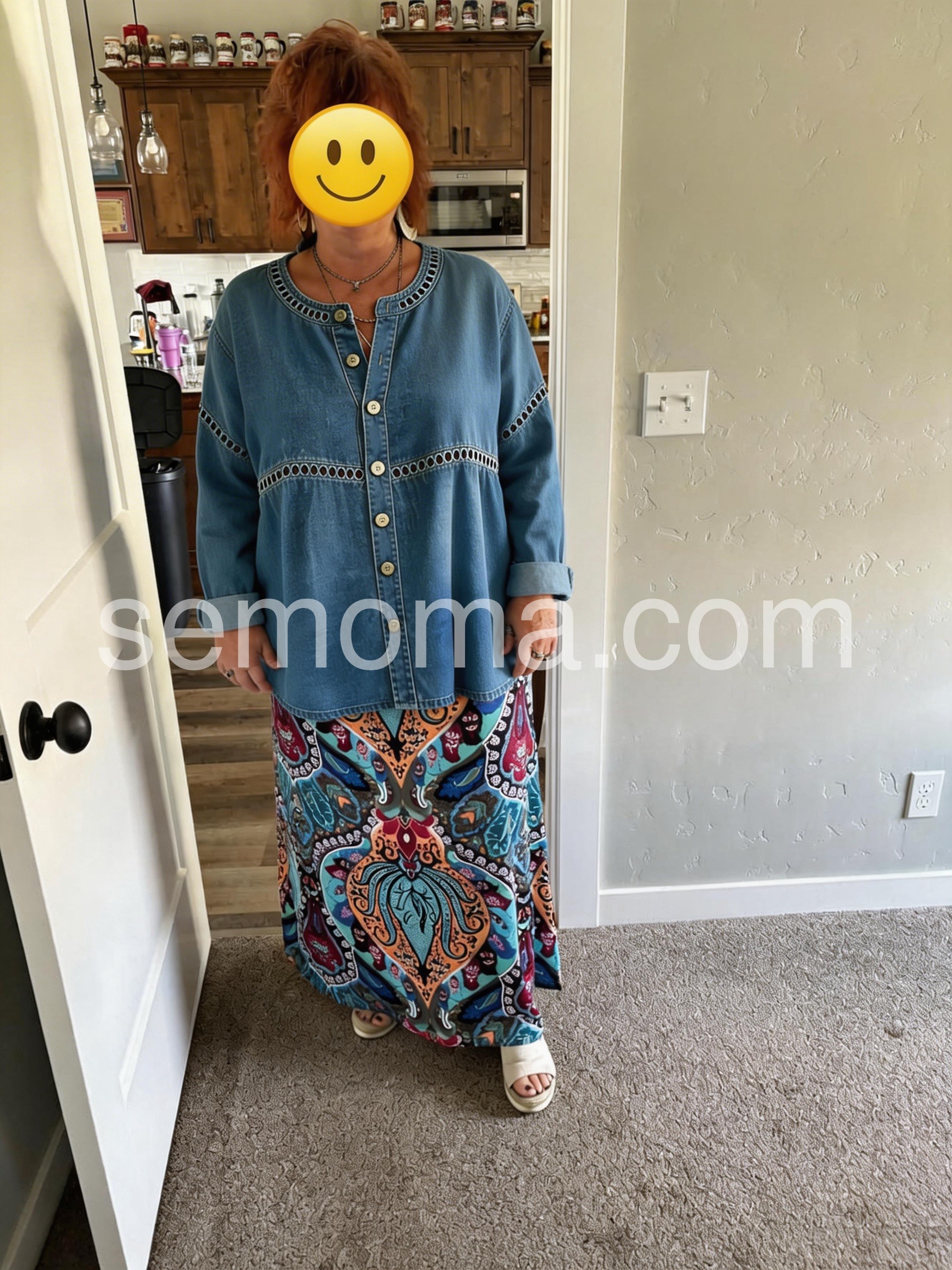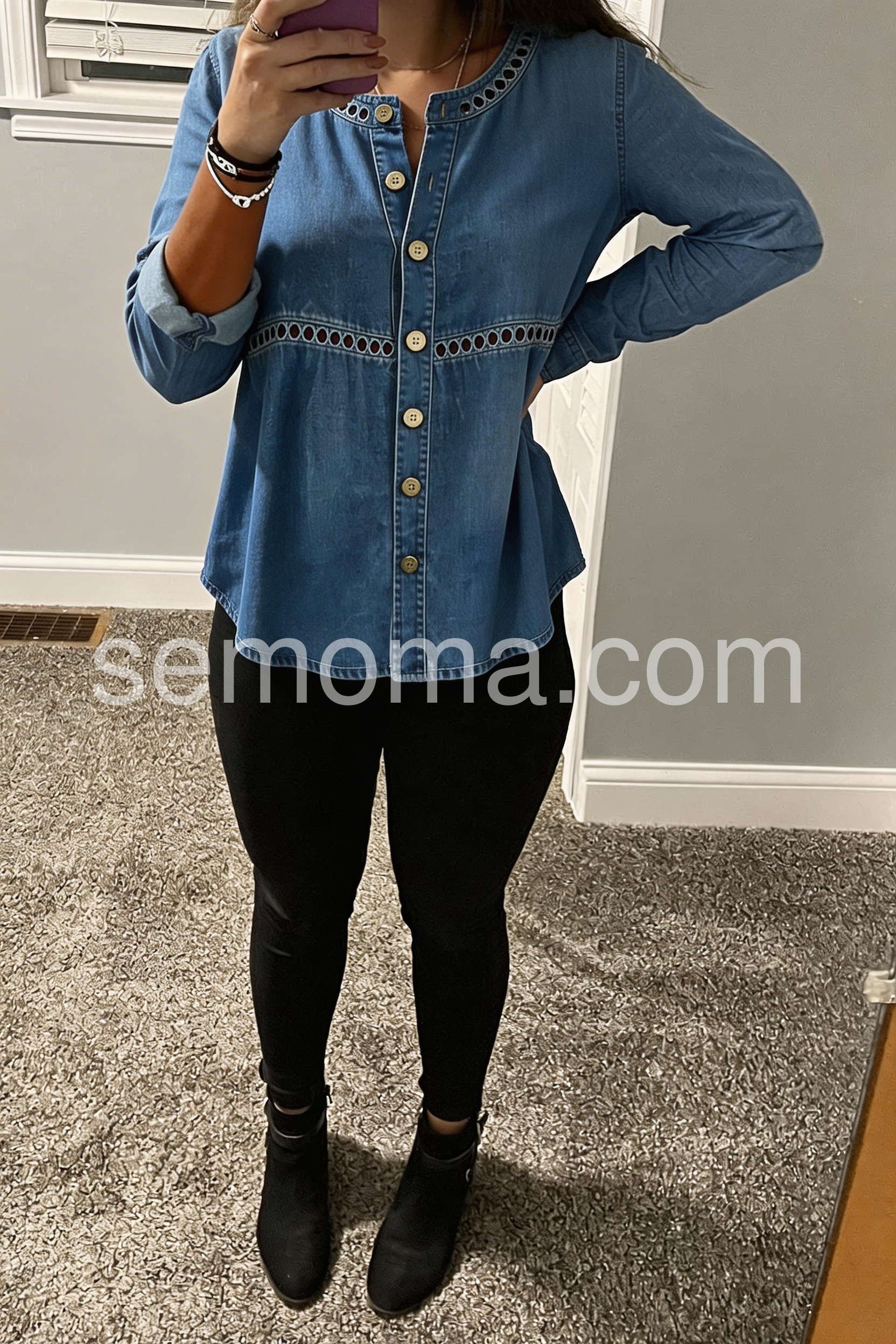 The little cutout embroidery around the waist and neckline makes this stand out from a basic denim shirt. It washes well and did not shrink. Very happy with this purchase.