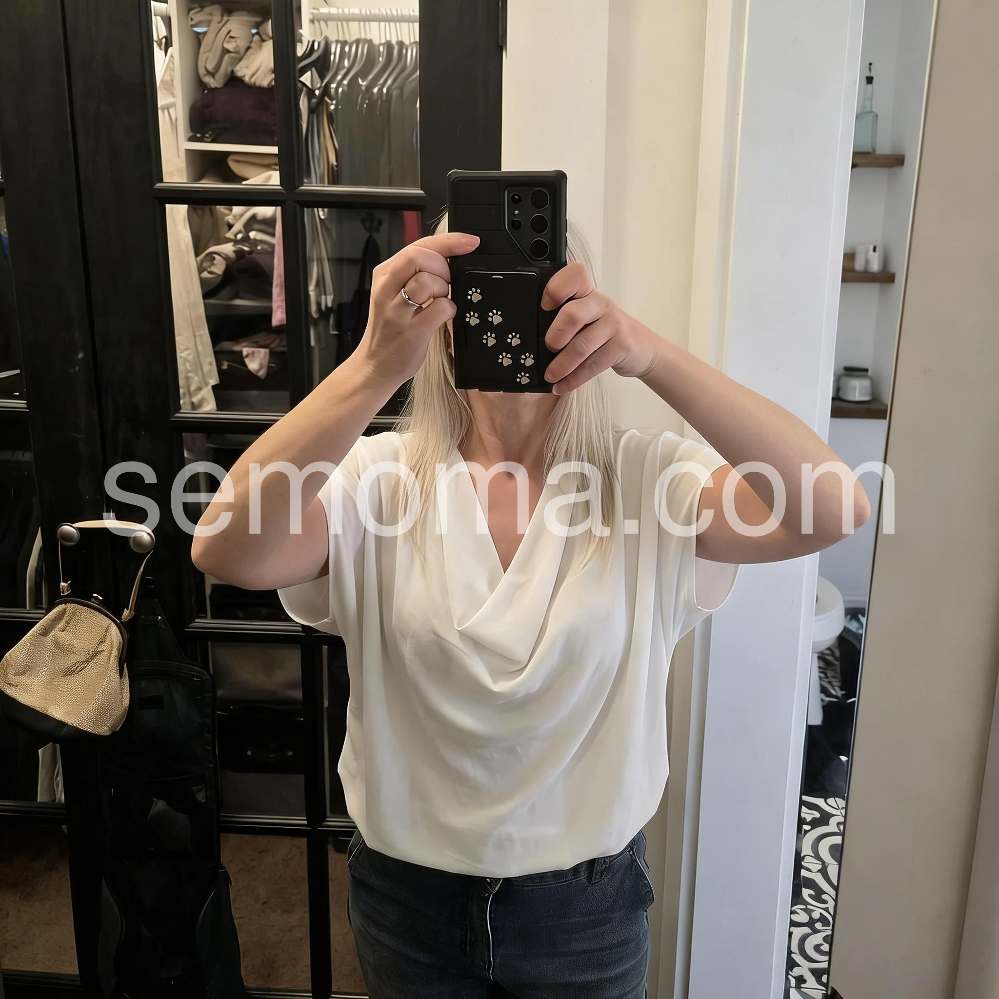Absolutely love this top! The draped cowl neck is so flattering and elegant. The material is lightweight and flowy, perfect for summer or layering under a cardigan. It looks fantastic paired with my favorite jeans.