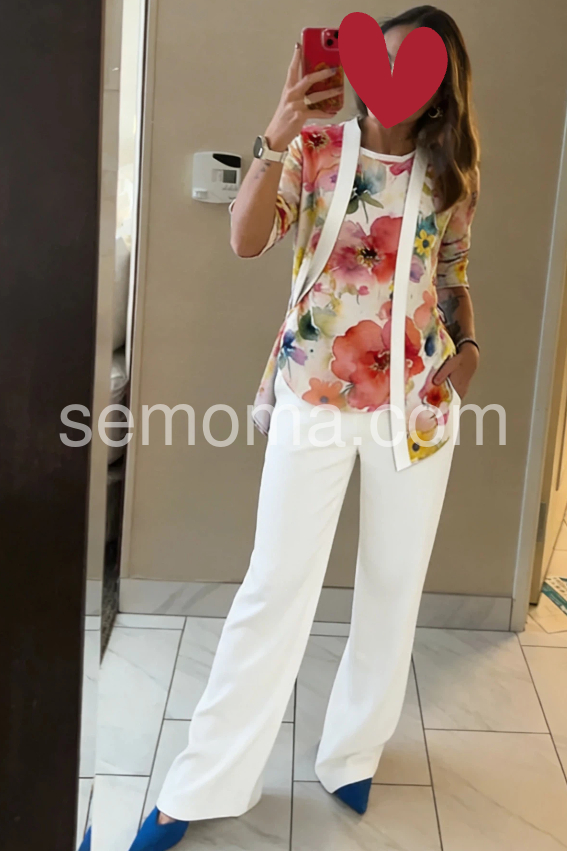 This three-piece set features a vibrant floral top and matching cardigan with white wide-leg pants. The relaxed fit offers comfort and elegance. Perfect for spring or summer occasions. Lightweight fabric ideal for casual outings. Effortlessly chic and coordinated.
