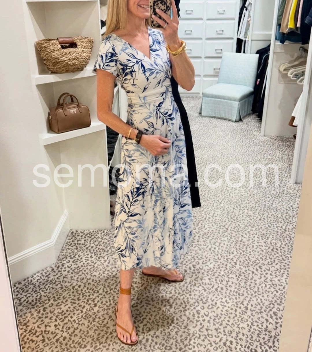 Trendy Plant Print V-Neck Short Sleeve Midi Dress