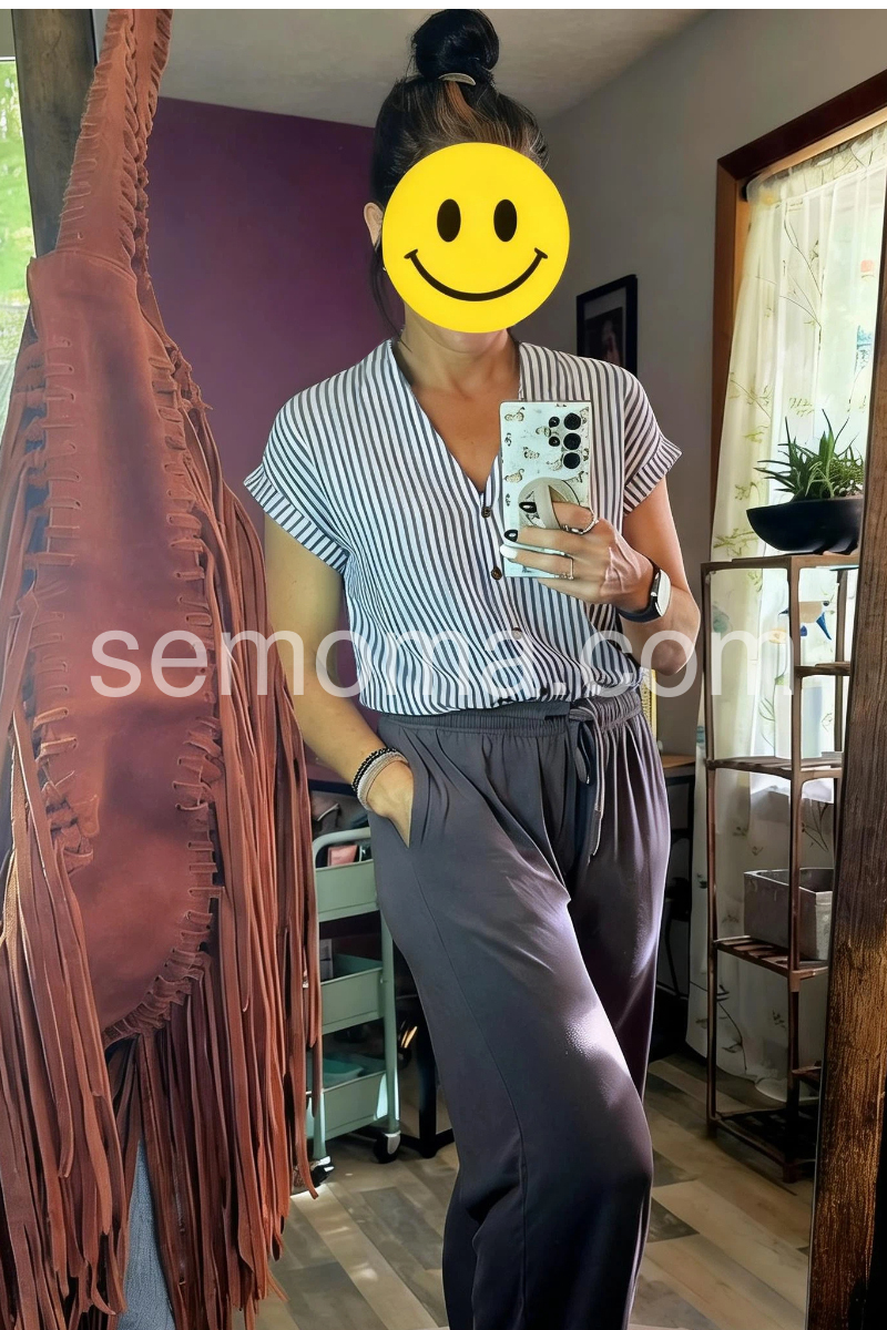 This V-neck top features vertical blue and white stripes with a front button closure. Rolled short sleeves add a relaxed, breezy touch. Lightweight fabric perfect for warm days. Pair with jeans or shorts for a timeless look. Effortlessly chic and easy to style.