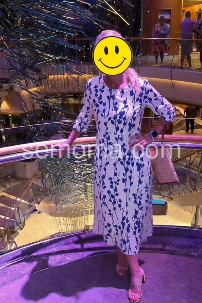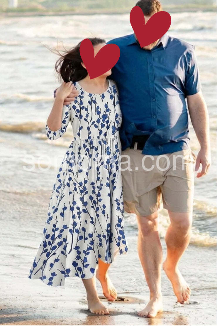 Embrace the serenity of seaside living in this Coastal Blue Botanical Print Midi Dress, a dreamy and elegant piece that captures the essence of Mediterranean charm. Crafted from lightweight, breathable fabric—likely cotton or linen blend—this midi dress features a crisp white base adorned with a delicate all-over print of navy blue leafy vines and botanical sprigs, evoking the beauty of coastal flora. The relaxed A-line silhouette flatters every figure, while the high waist and gentle gathering create a soft, flowing shape that moves gracefully with you. Short sleeves and a round neckline offer timeless comfort and ease, perfect for warm days by the sea. Designed with functional side pockets, it’s both stylish and practical—ideal for strolls through whitewashed villages, beachside brunches, or summer vacations.