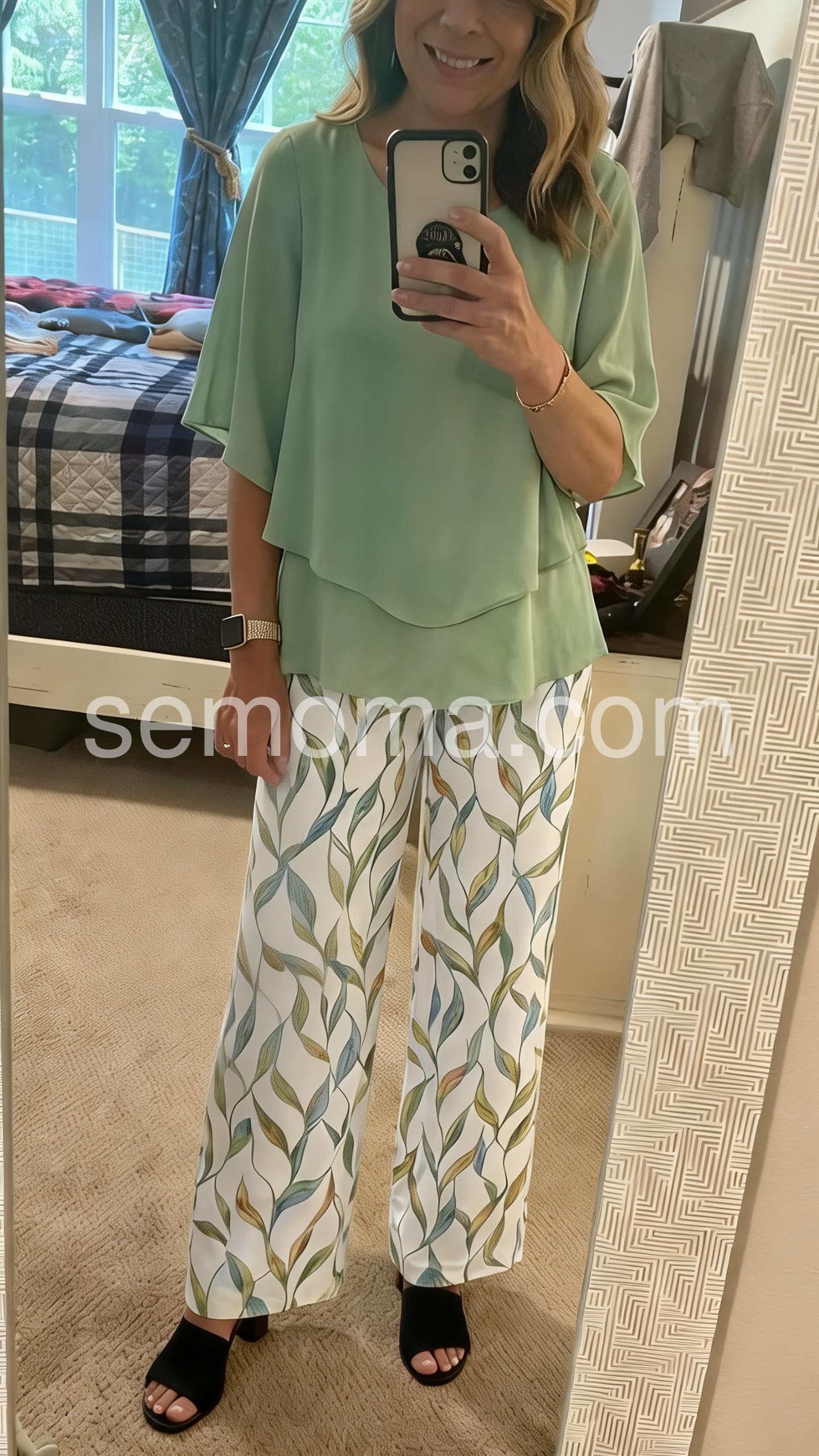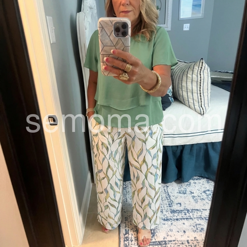 This two-piece outfit features a flowy green layered top with batwing sleeves. Paired with wide-leg pants in a soft leaf print. Lightweight and breathable fabric for all-day comfort. Perfect for casual outings or stylish everyday wear. Effortlessly chic and flattering.