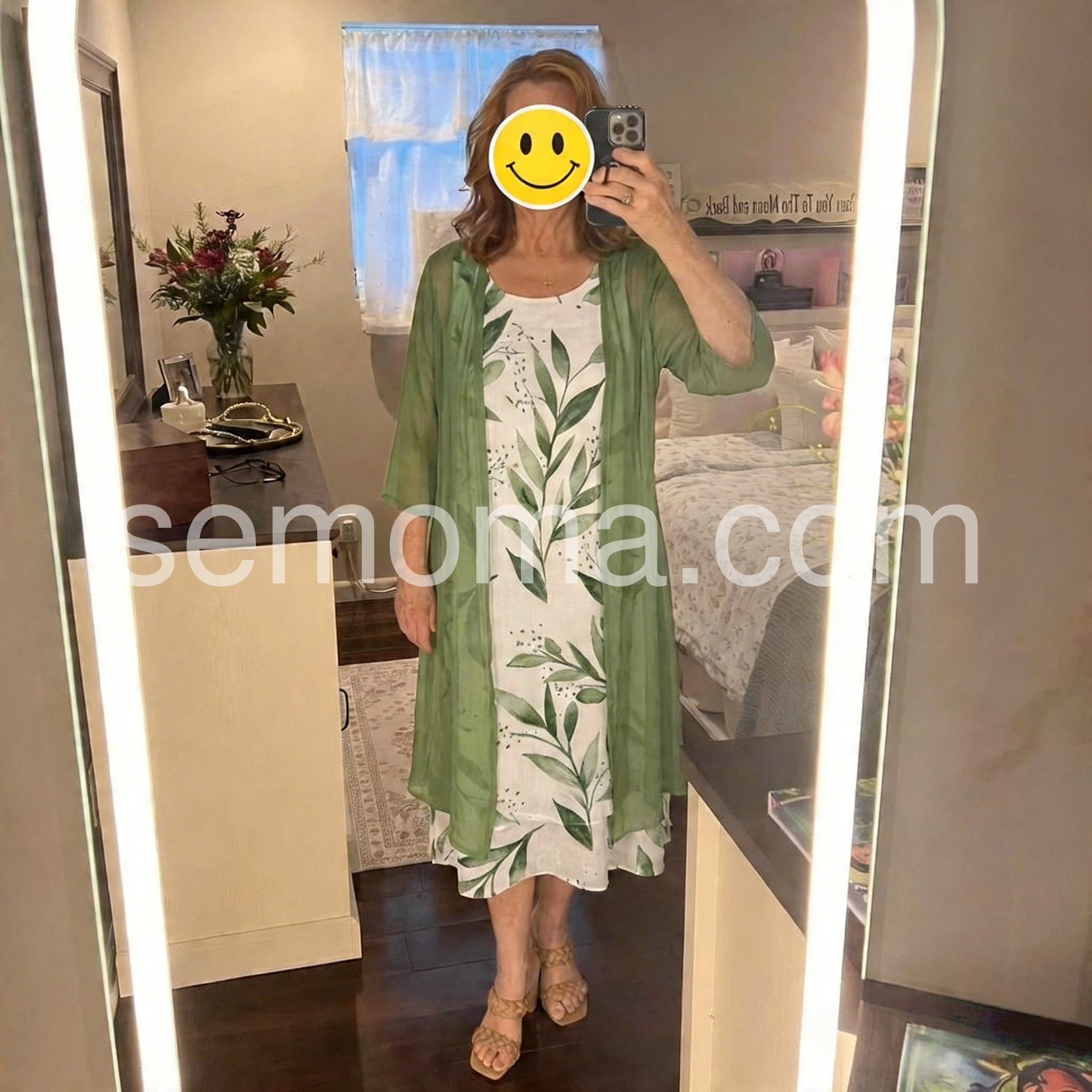 Green Leaf Print Dress Cardigan Two Piece Set
