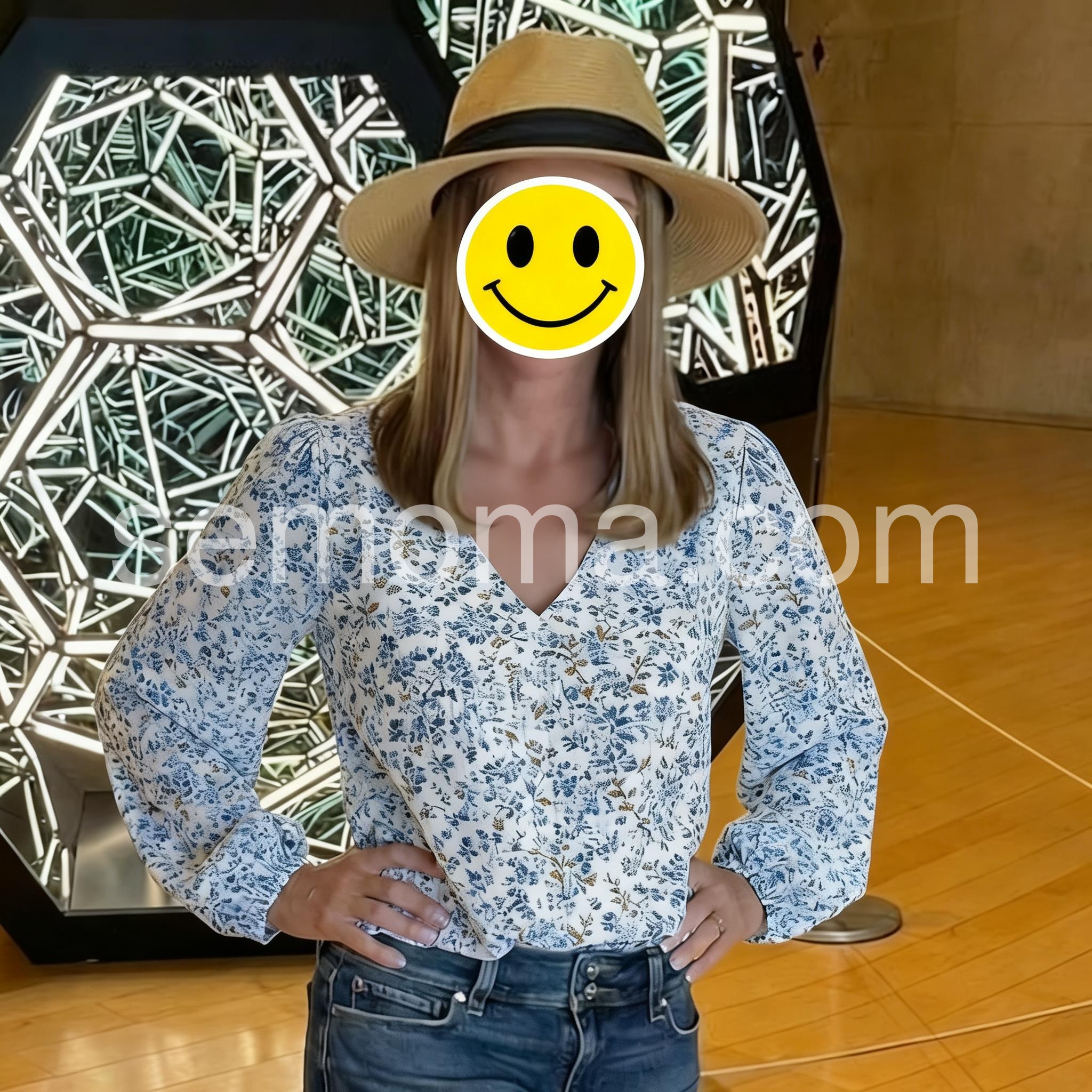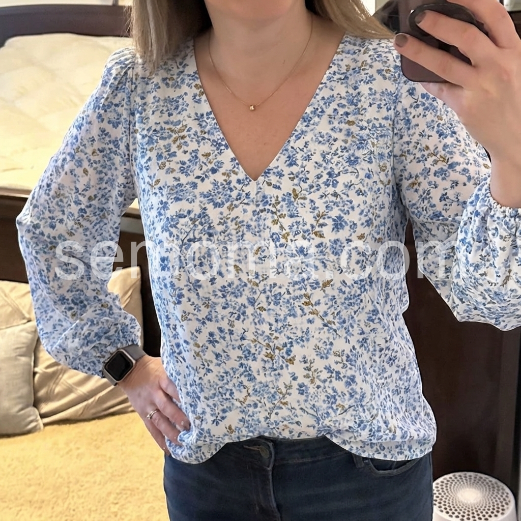This V-neck top features a delicate blue floral print on a soft white base. Long puff sleeves with gathered cuffs add feminine flair. Lightweight fabric perfect for spring and summer. Pair with jeans or high-waisted pants for a stylish look. Effortlessly elegant with vintage charm.