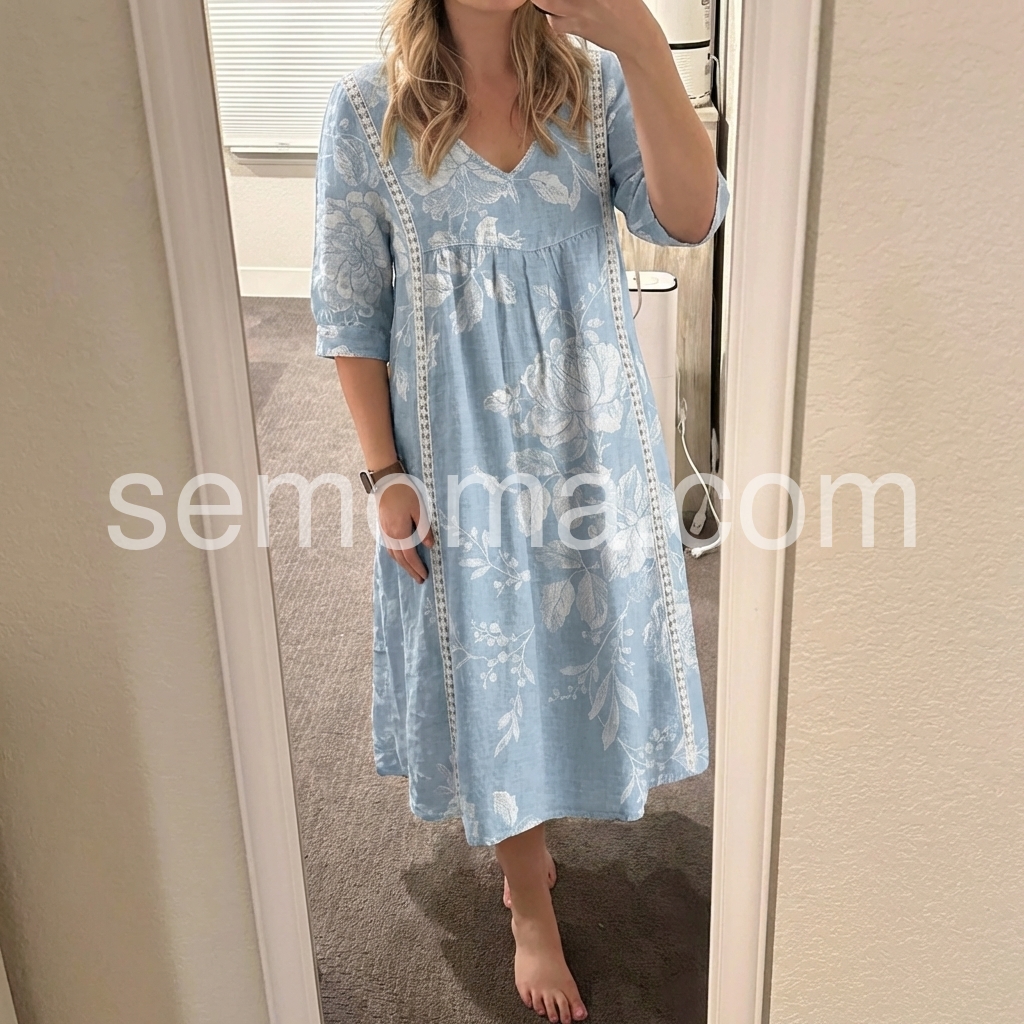 I absolutely love this dress! The light blue color is so pretty for spring, and the white floral pattern gives it a great boho vibe. Best part? It has pockets! The fit is loose and very forgiving, making it incredibly comfortable for all-day wear.