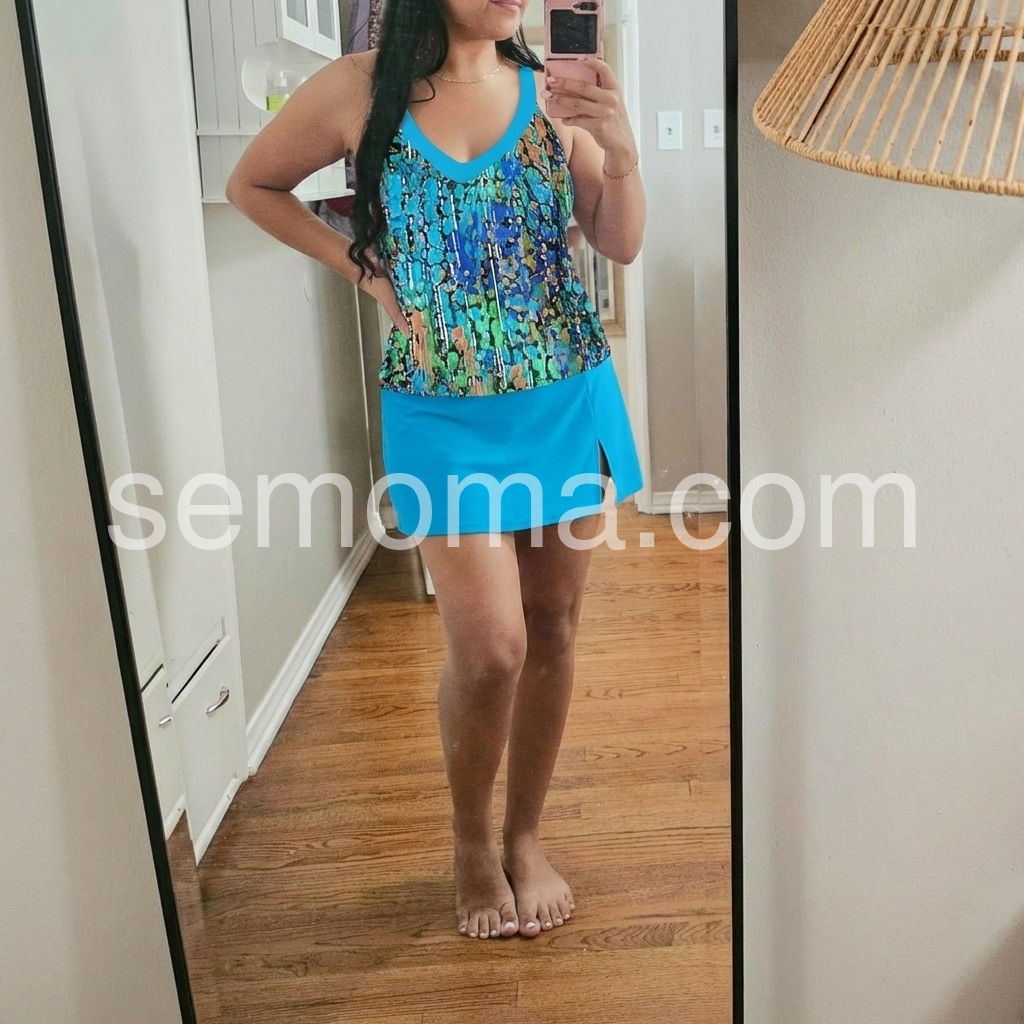Very flattering to figure. Accentuates the waist and hides my upper thighs. If you're like me and a tad insecure about showing your booty or belly, this suit covers those areas and is super flattering on. I feel very comfortable and confident in this bathing suit.