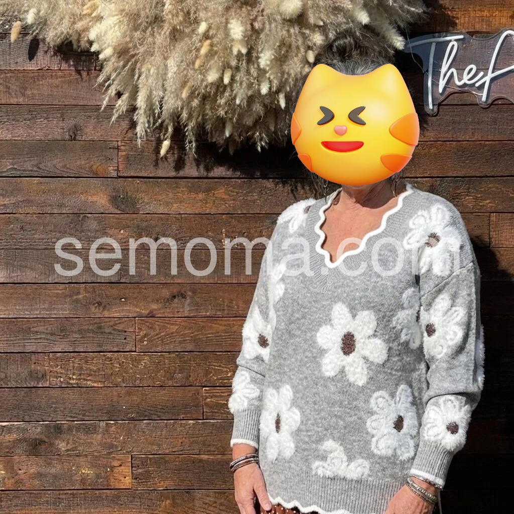 This Grey V-Neck Floral Print Sweater will keep you fashionably warm all season. With its classic v-neck design and floral print, this sweater has the perfect combination of style and comfort. Perfect for any occasion, this sweater is sure to keep you looking stylish.