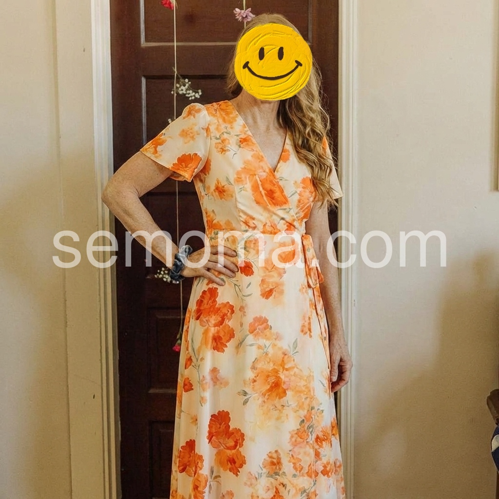 Beautiful summer dress. The orange flowers are so pretty and cheerful. I wore this to a summer wedding and it was lightweight enough to keep me cool during the outdoor ceremony, yet elegant enough for the reception. Five stars!