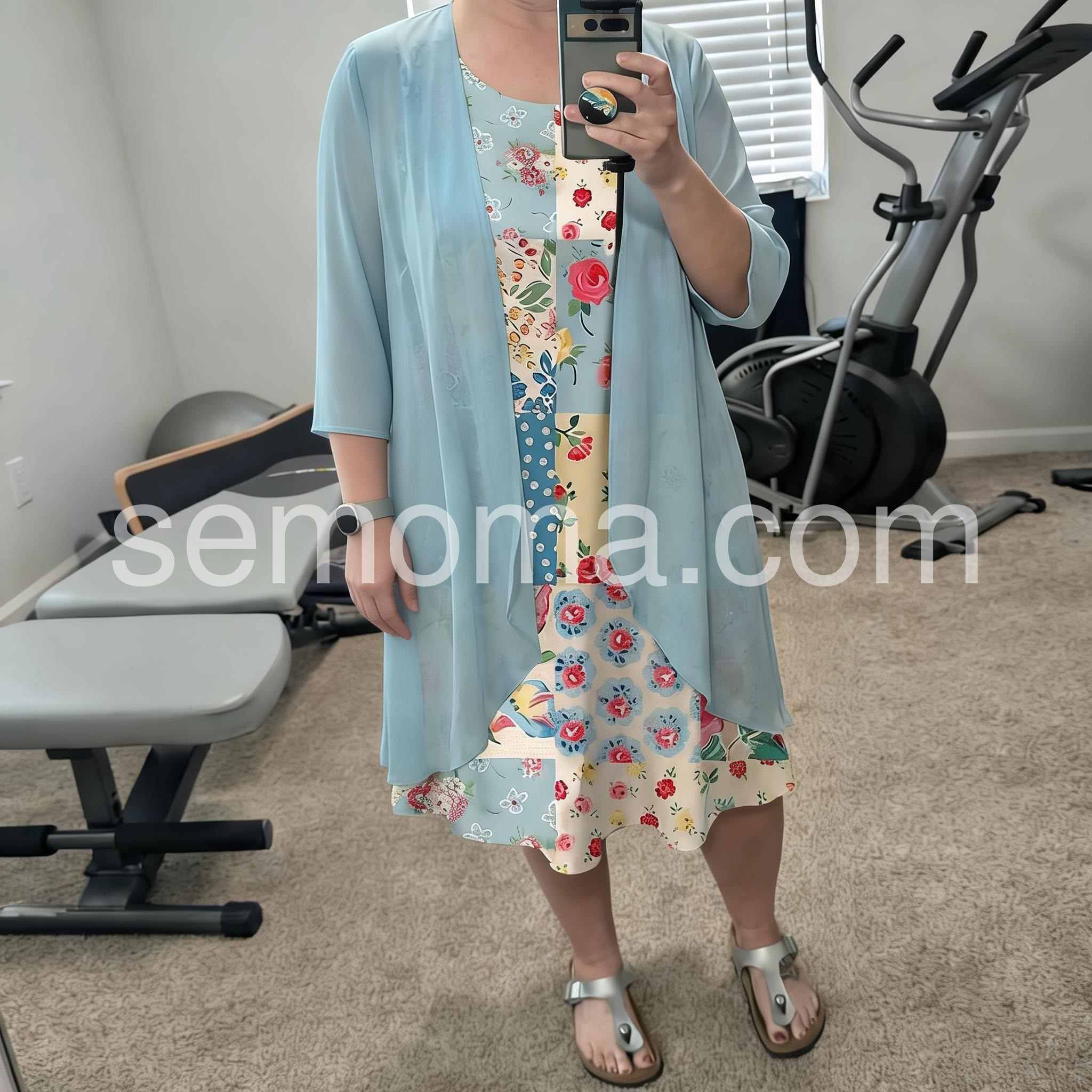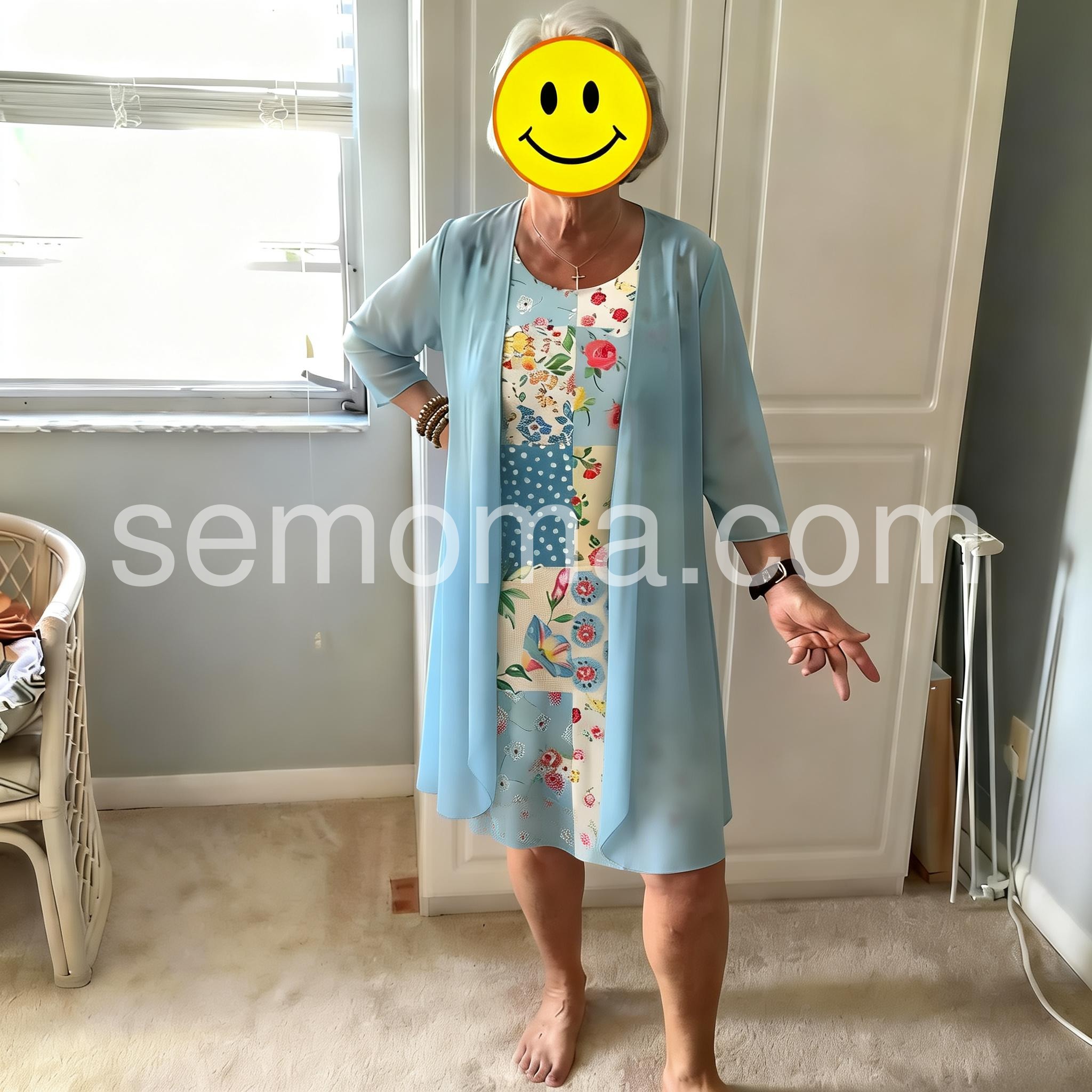 This colorful dress features a patchwork design with floral and polka dot patterns. Paired with a flowing light blue jacket for a layered look. Lightweight and perfect for spring or summer days. Ideal for casual outings or garden events. Stylish and full of charm.