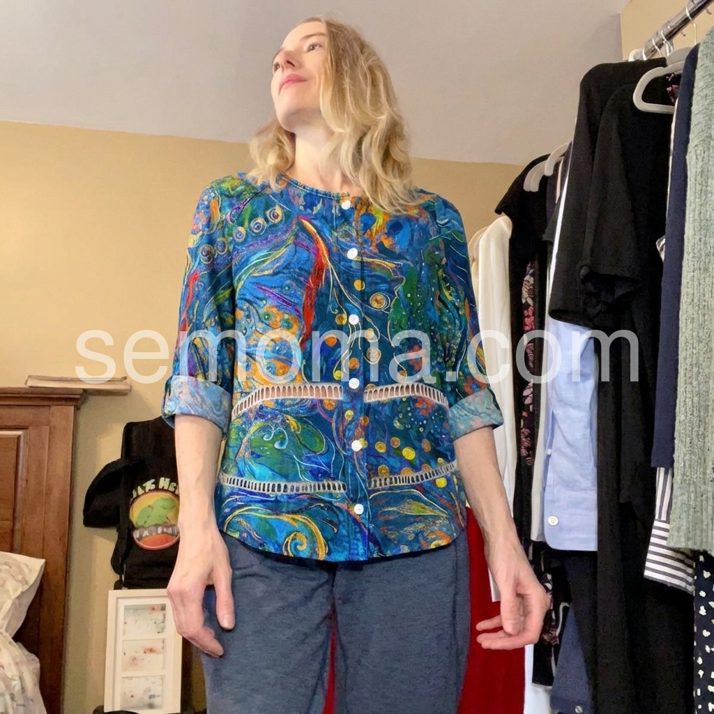 Such a fun and artsy shirt! I really appreciate the little details, like the white buttons and the horizontal lace inserts. The roll-up sleeves are super convenient. It washes well and hasn't faded at all. Highly recommend!