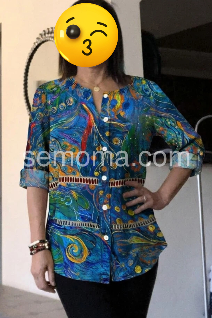 This long-sleeve button-up top features a bold blue base with colorful abstract patterns. The relaxed fit and rolled sleeves add comfort and style. Perfect for casual wear or bohemian outfits. Pair with jeans or leggings for effortless flair. Lightweight fabric ideal for warm days.