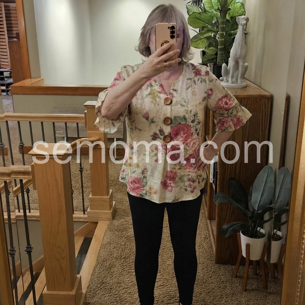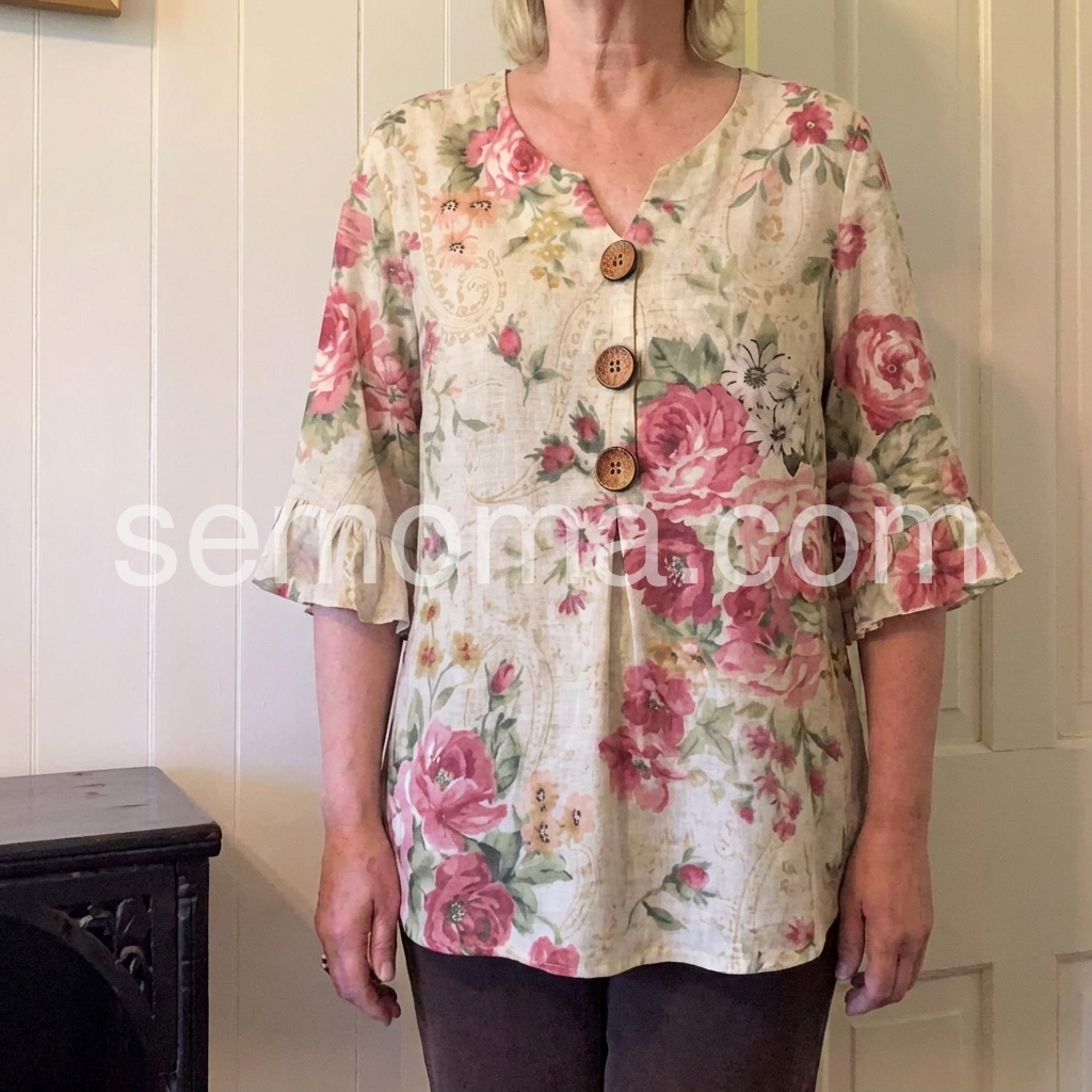 This lightweight blouse features a soft floral print with pink roses on a cream base. V-neckline with wooden buttons down the front. Flared three-quarter sleeves with ruffle details. Perfect for spring or summer outfits. Effortlessly feminine and relaxed.