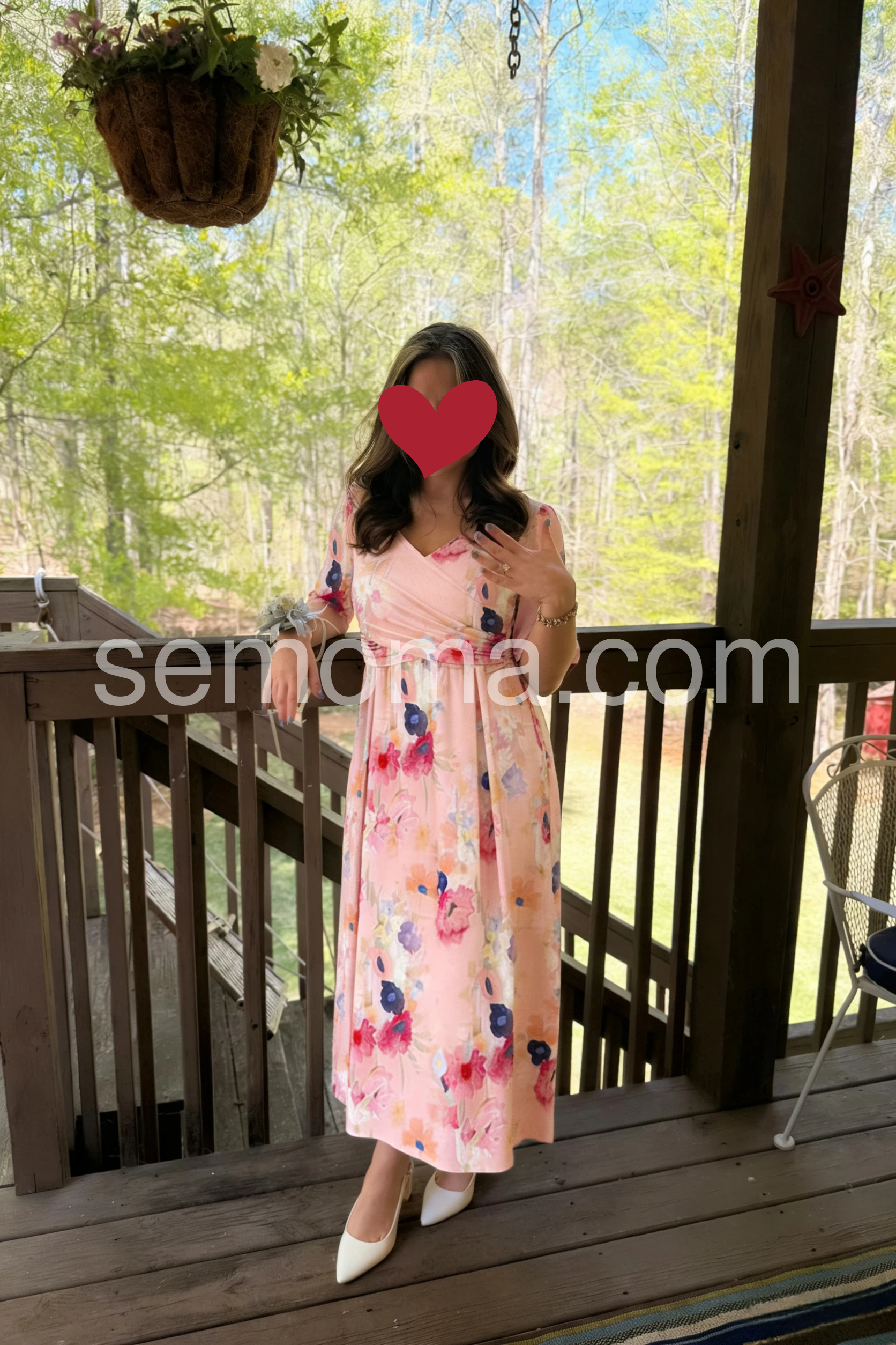 The crossover v-neck lays perfectly without exposing too much. It fits perfectly around my bust and waist. The light pink color with the bright flowers is so cheerful. I get compliments every time I wear it.
