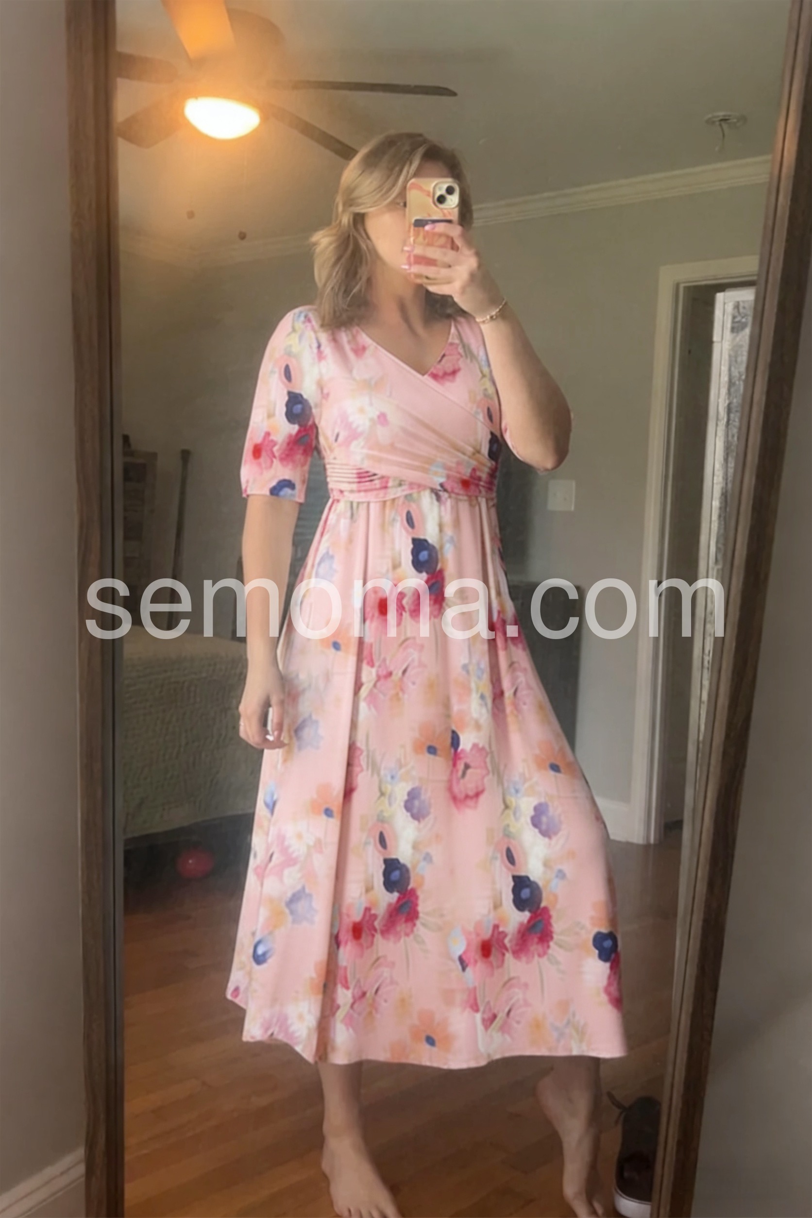 This midi dress features a soft pink base with vibrant floral prints. The V-neck and short sleeves offer a feminine touch. Side pockets add practicality and ease. Lightweight fabric perfect for spring or summer days. Ideal for casual outings or garden parties.