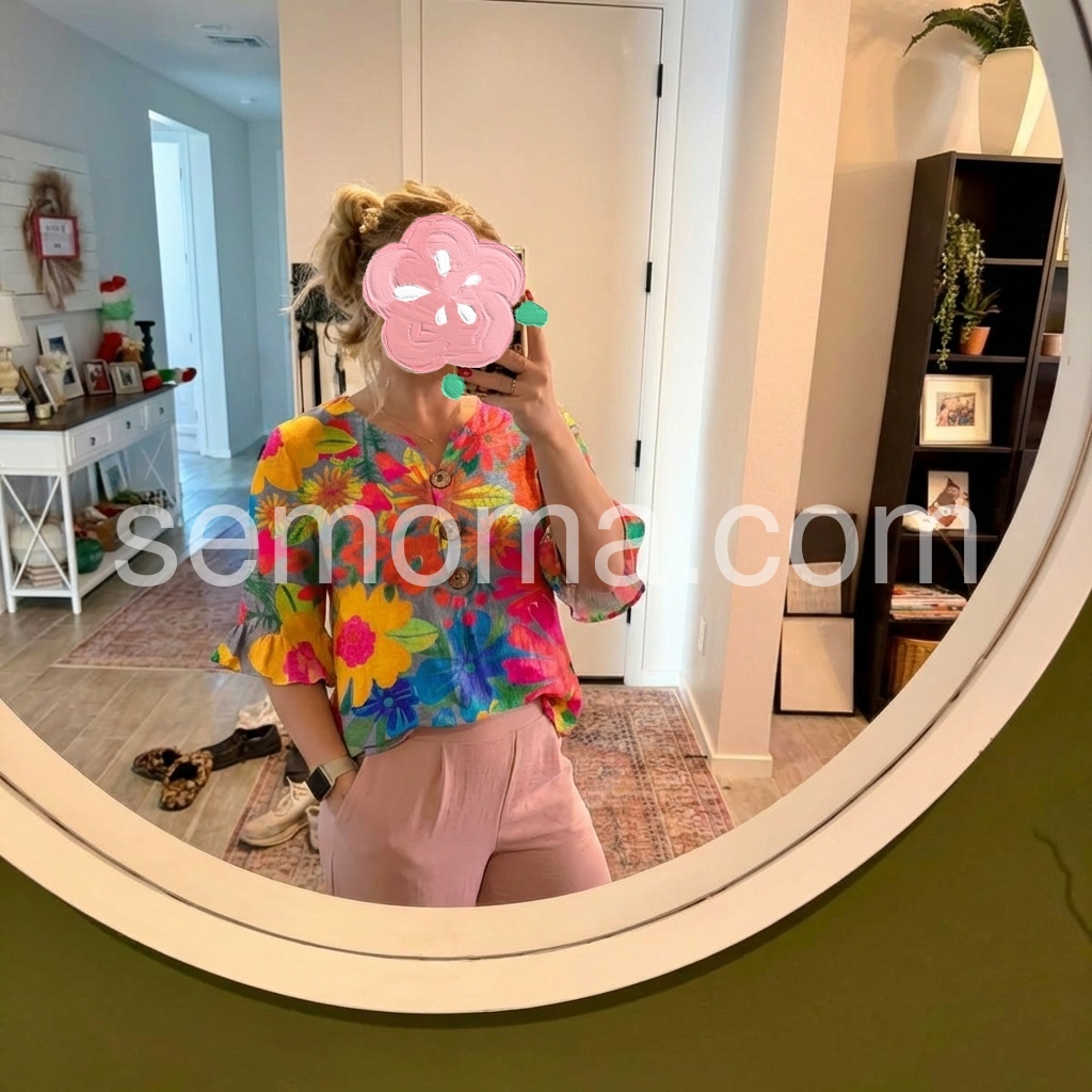 Hey fashion fam, this blouse is a VIBE that fixes your "boring daily top" pain point! Tired of tops that are too plain or too flashy? The vibrant, oversized floral print adds a bold pop of color, while the notched V-neck flatters all necklines.
