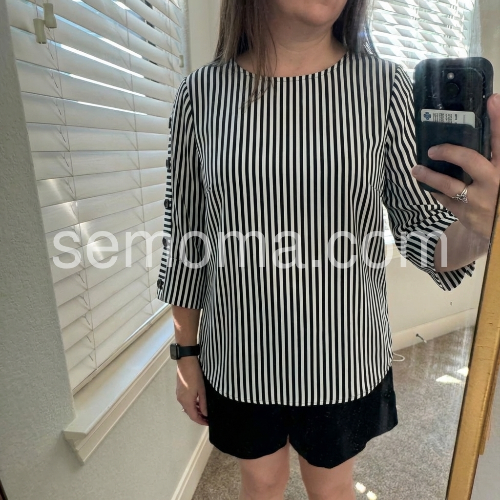 This vertical striped top features a relaxed fit with a round neckline. Three-quarter sleeves with button details and rolled cuffs. Lightweight fabric perfect for everyday wear. Ideal for pairing with jeans or trousers. Timeless and stylish design.