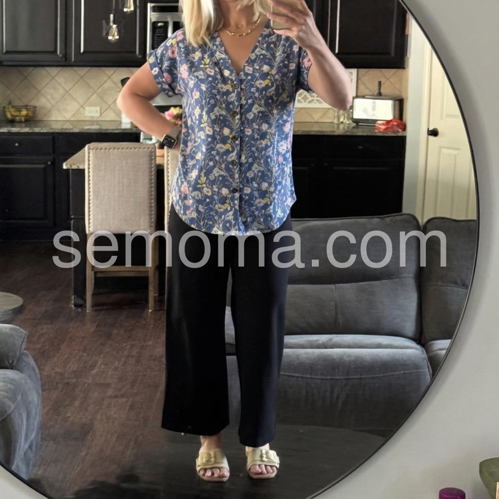 This short-sleeve V-neck blouse features a delicate floral print on a deep navy background. The button-down front adds a polished touch. Lightweight fabric perfect for warm weather. Pair with jeans or skirts for effortless style. Ideal for casual outings or spring days.