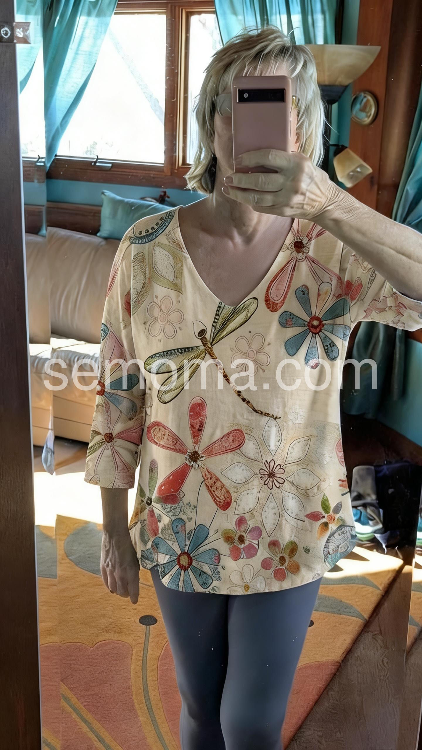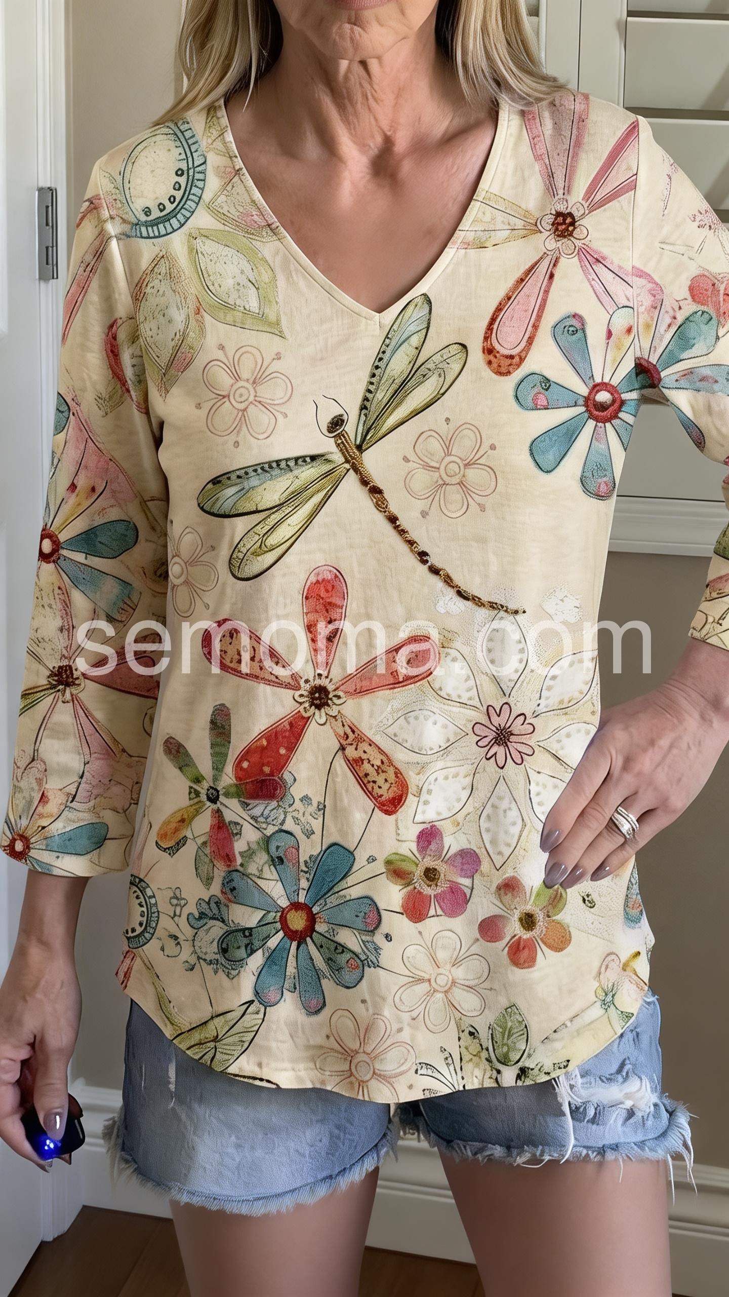 This loose-fitting top features a charming floral and dragonfly print on a soft cream base. With a deep V-neck. Perfect for casual days or bohemian style. Pair with white pants for a fresh, airy vibe. Light, artistic, and full of nature-inspired charm.