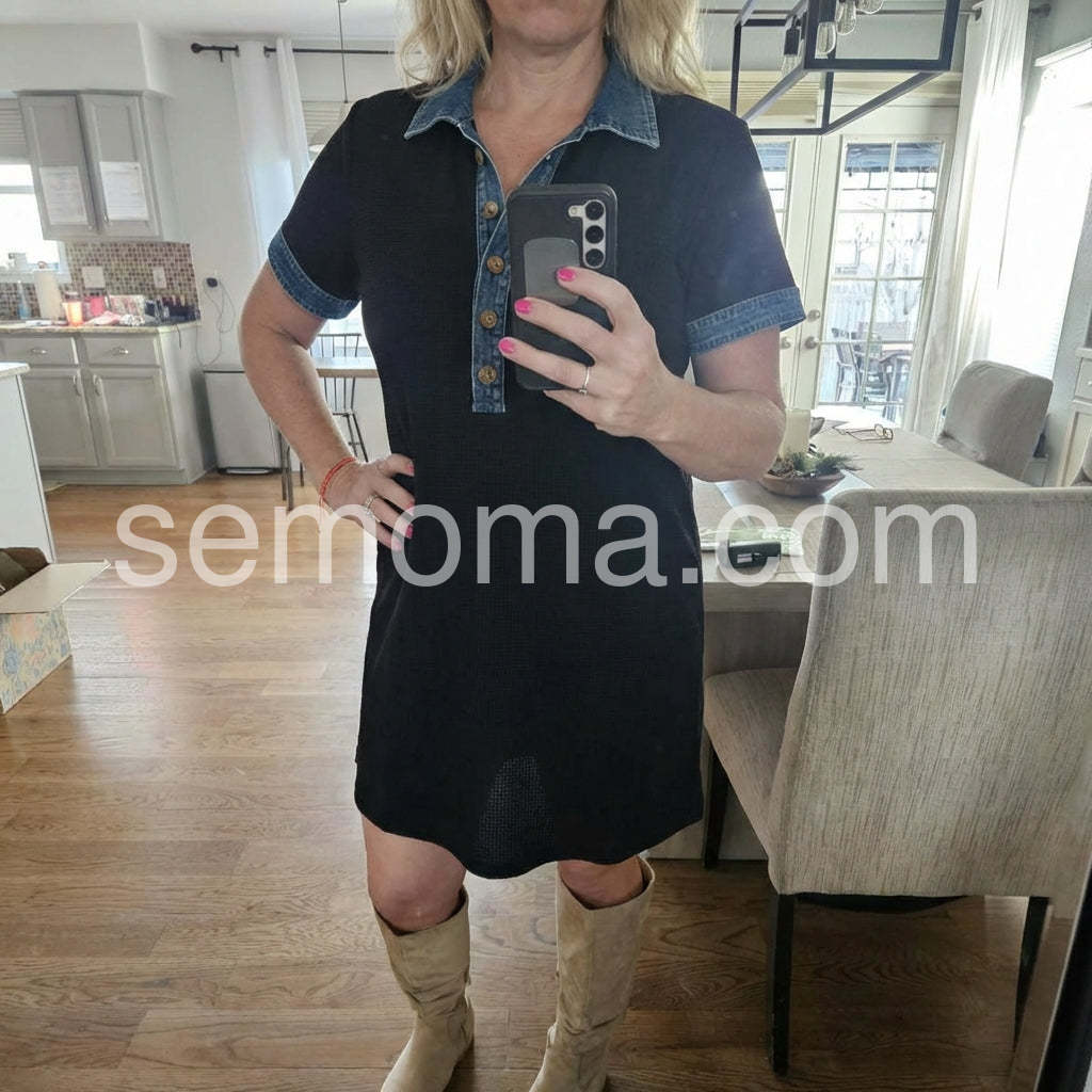 Black Denim Trim Short Sleeve Mini Dress