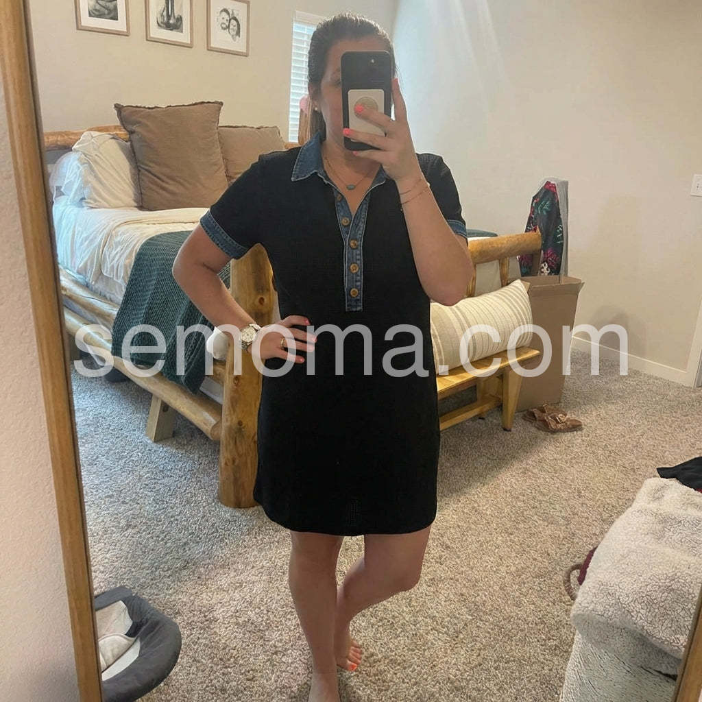 I absolutely love the denim accents on this dress! It adds such a cute casual vibe to a basic black dress. Super comfortable and fits true to size. Perfect for running errands or a casual lunch.