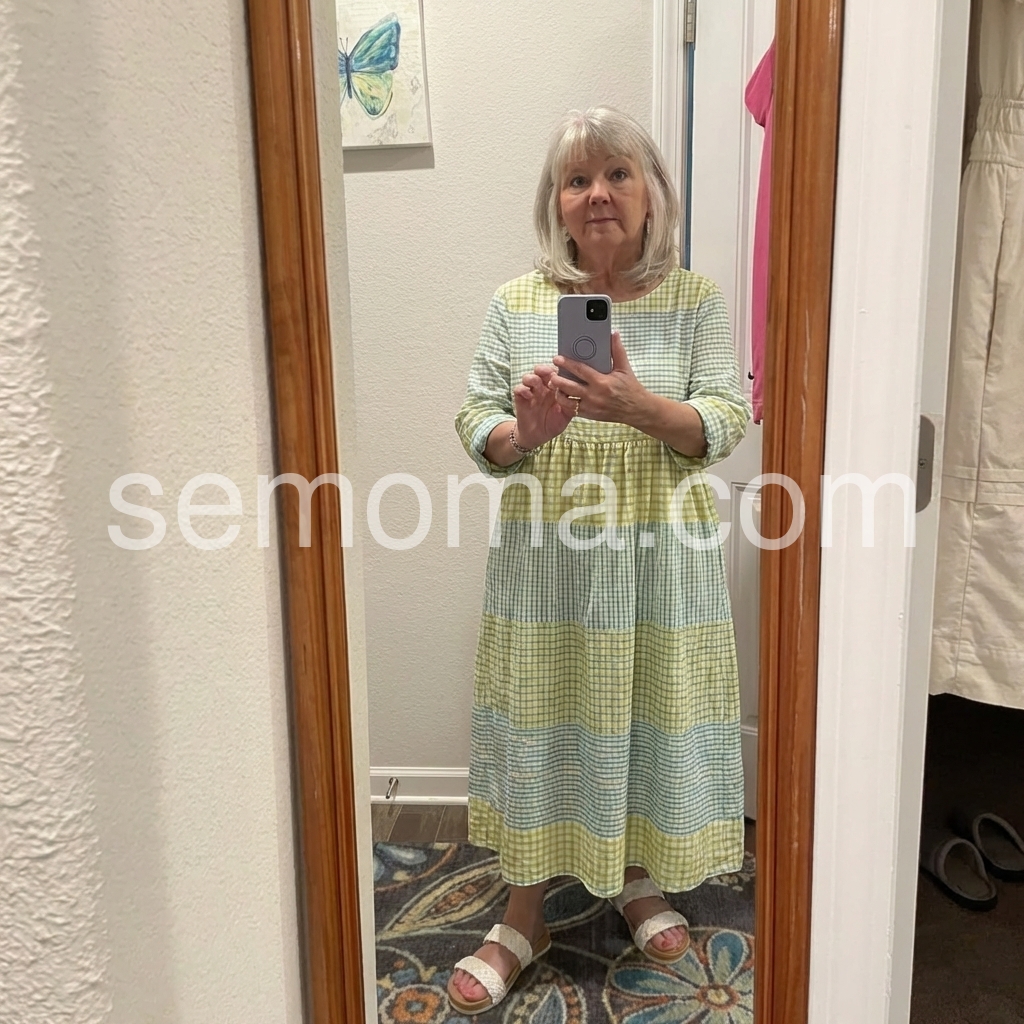 This midi dress celebrates effortless summer style with a playful color-block gingham design. The round neck, 3/4 sleeves, and tiered skirt offer a relaxed, flowy fit.