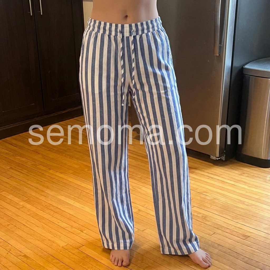 These relaxed-fit pants feature bold vertical stripes in navy and white. Elastic waistband with drawstring for comfort. Wide-leg design and lightweight fabric perfect for summer. Ideal for beach outings or casual wear. Effortlessly stylish and breezy.
