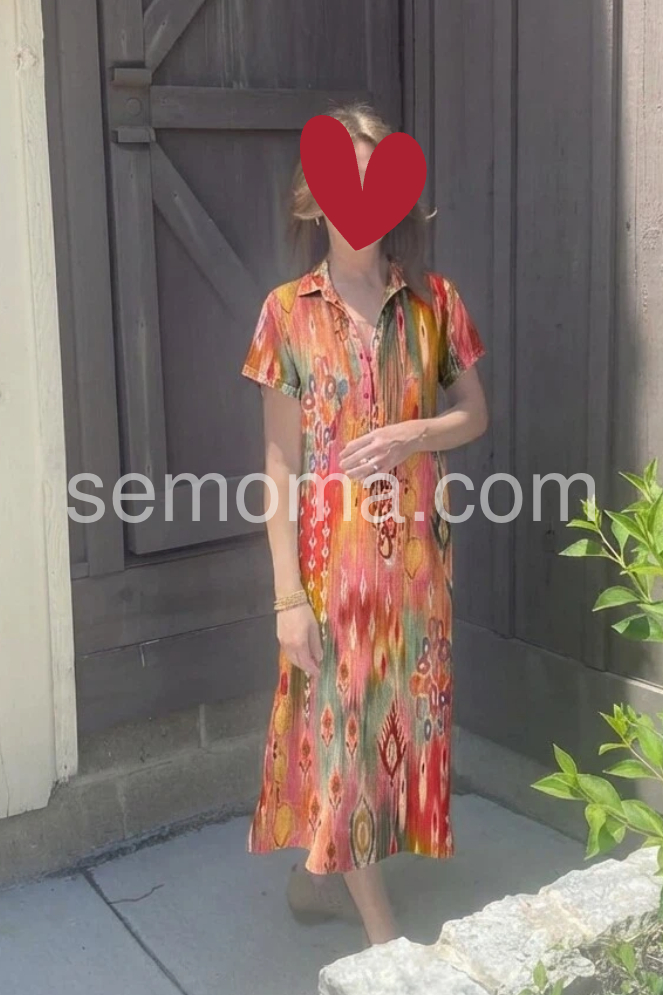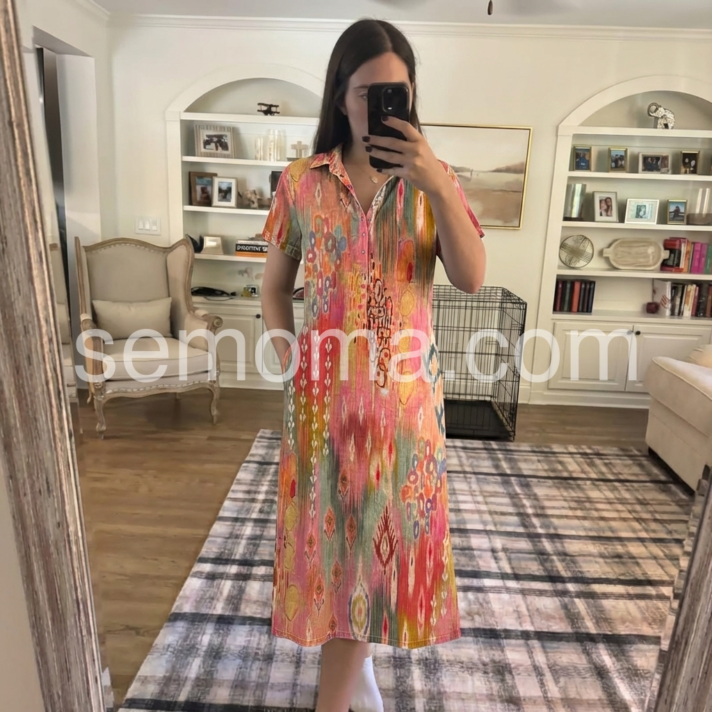 This mid-length shirt dress features a bold ikat pattern in warm reds, pinks, and earthy tones. With short sleeves, a button-down front, and relaxed fit for comfort. Perfect for summer days or casual outings. Pair with sandals for a laid-back, stylish look. Effortlessly elegant with global flair.