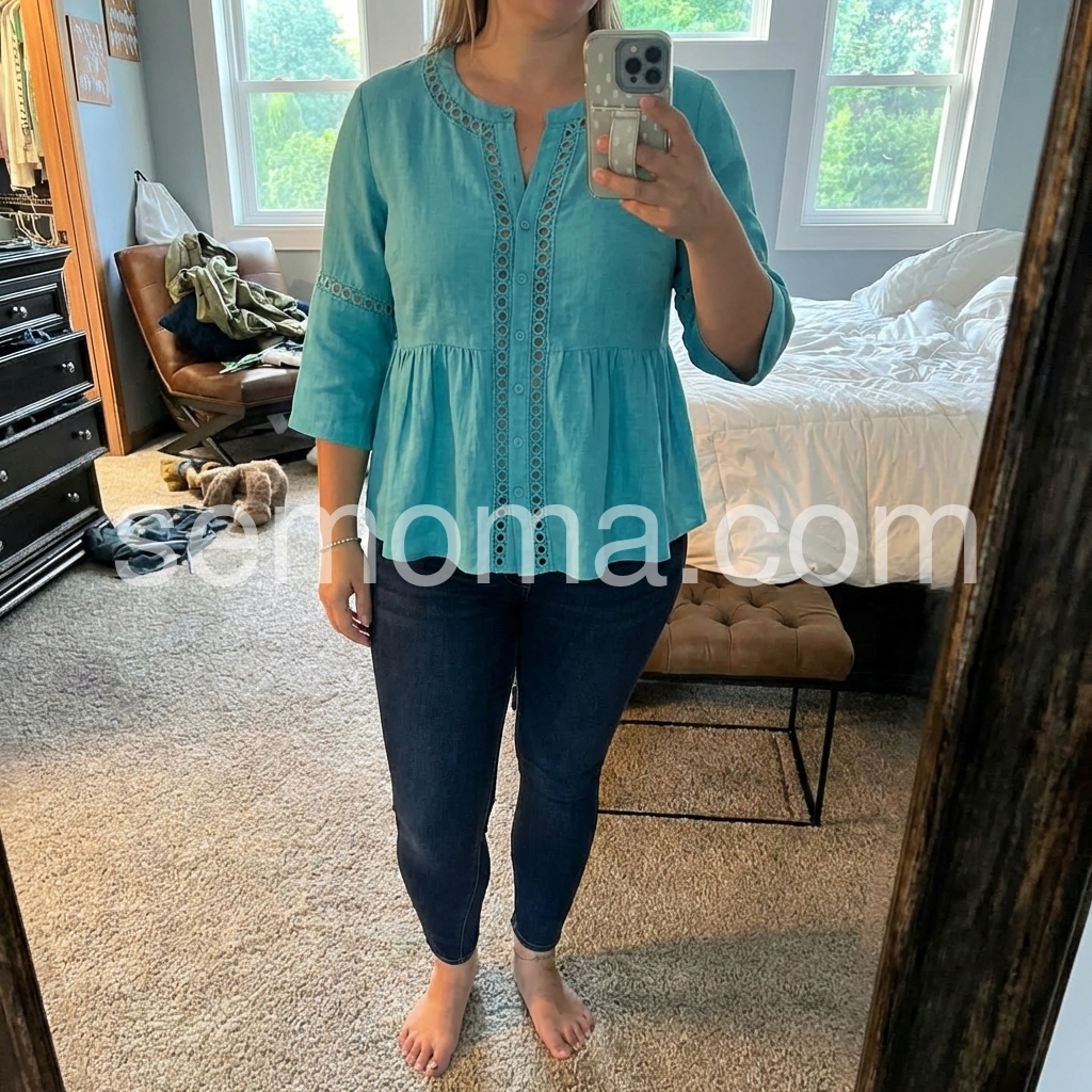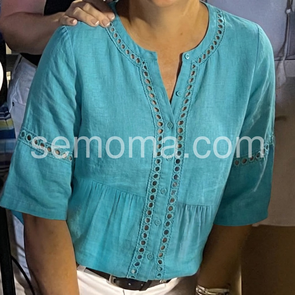 This loose-fit top features a vibrant teal hue with delicate eyelet cutouts along the neckline and sleeves. Button-down front and flared hem add a feminine touch. Three-quarter sleeves offer comfort and style. Lightweight fabric perfect for warm weather. Effortlessly chic with a relaxed, bohemian vibe.