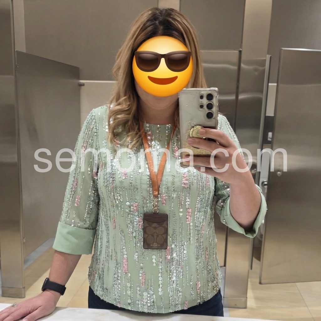 This top is absolutely stunning! The mint green color is so refreshing, and the sequins add just the right amount of sparkle without being overwhelming. Perfect for my upcoming holiday party. Fit is true to size.
