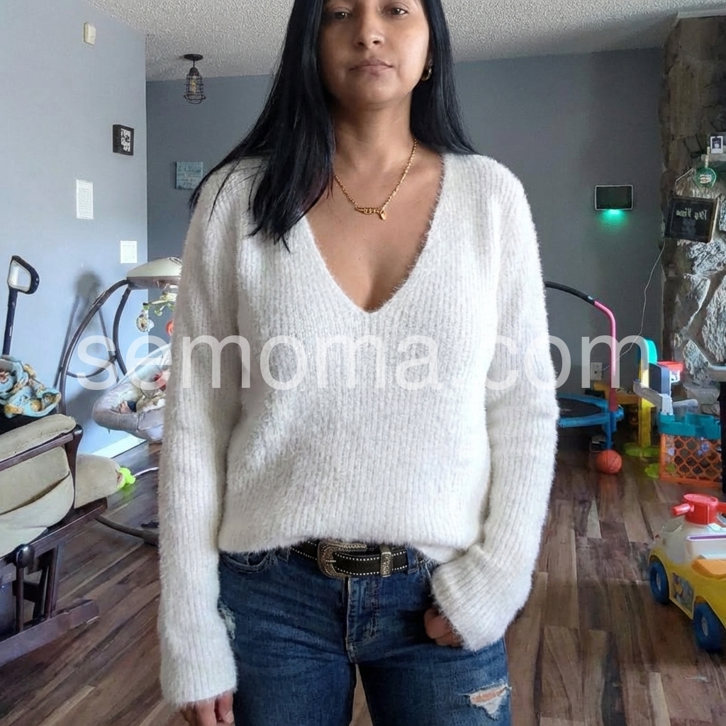 Warm and fuzzy, this precious pullover can be styled two ways! Designed with a V-cut, the knit sweater can be donned with a plunging front or worn backward for a sophisticated bateau neckline. We love how it shows off an unexpected hint of skin during colder months. Wear it for day with skinny jeans and a studded belt and at night with a sheer lace layer and a high-slit skirt.