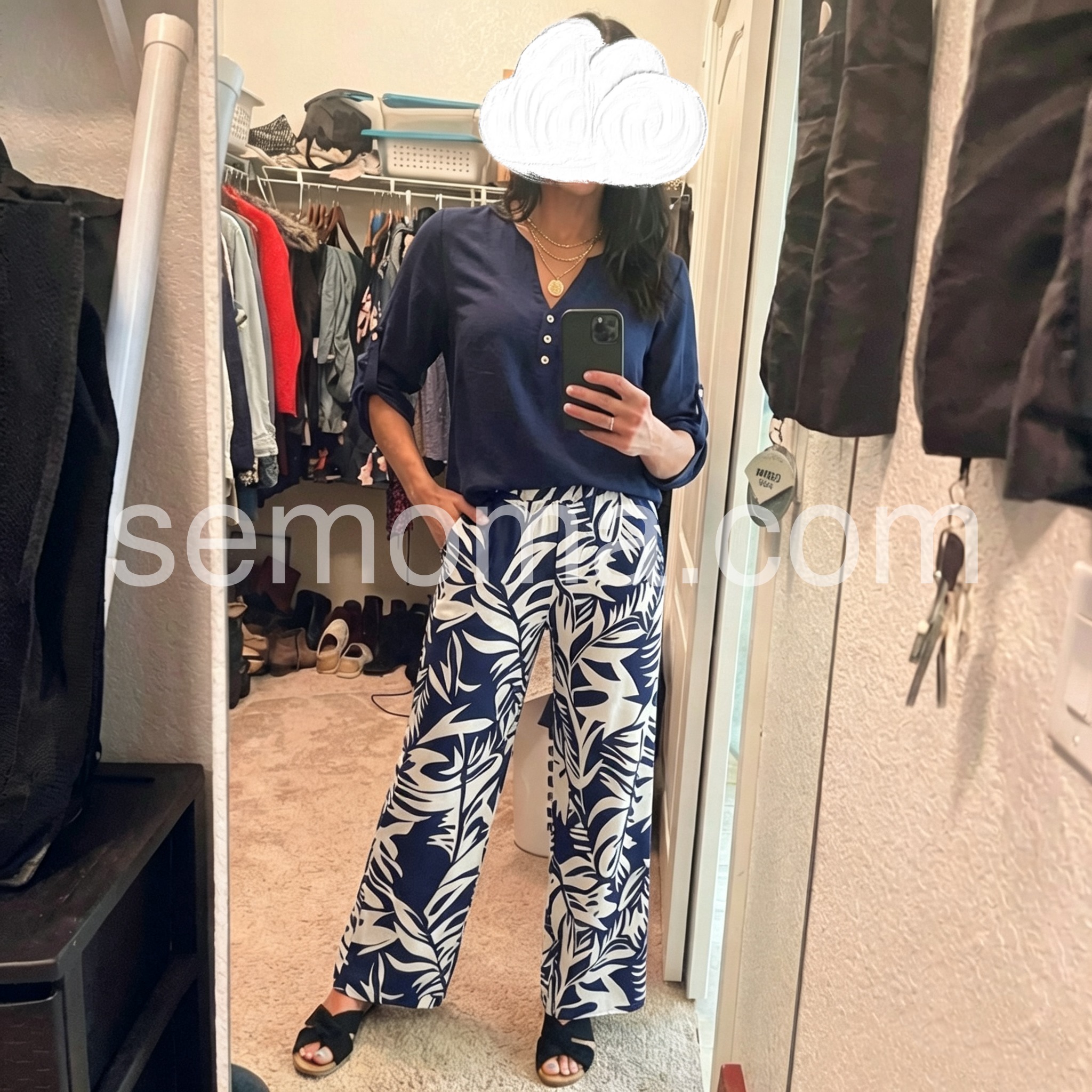 This outfit is so comfortable and stylish. I am 5 ft 4 in and the pants hit right at my sandals, so no hemming required for me. The bold leaf print hides any imperfections perfectly.
