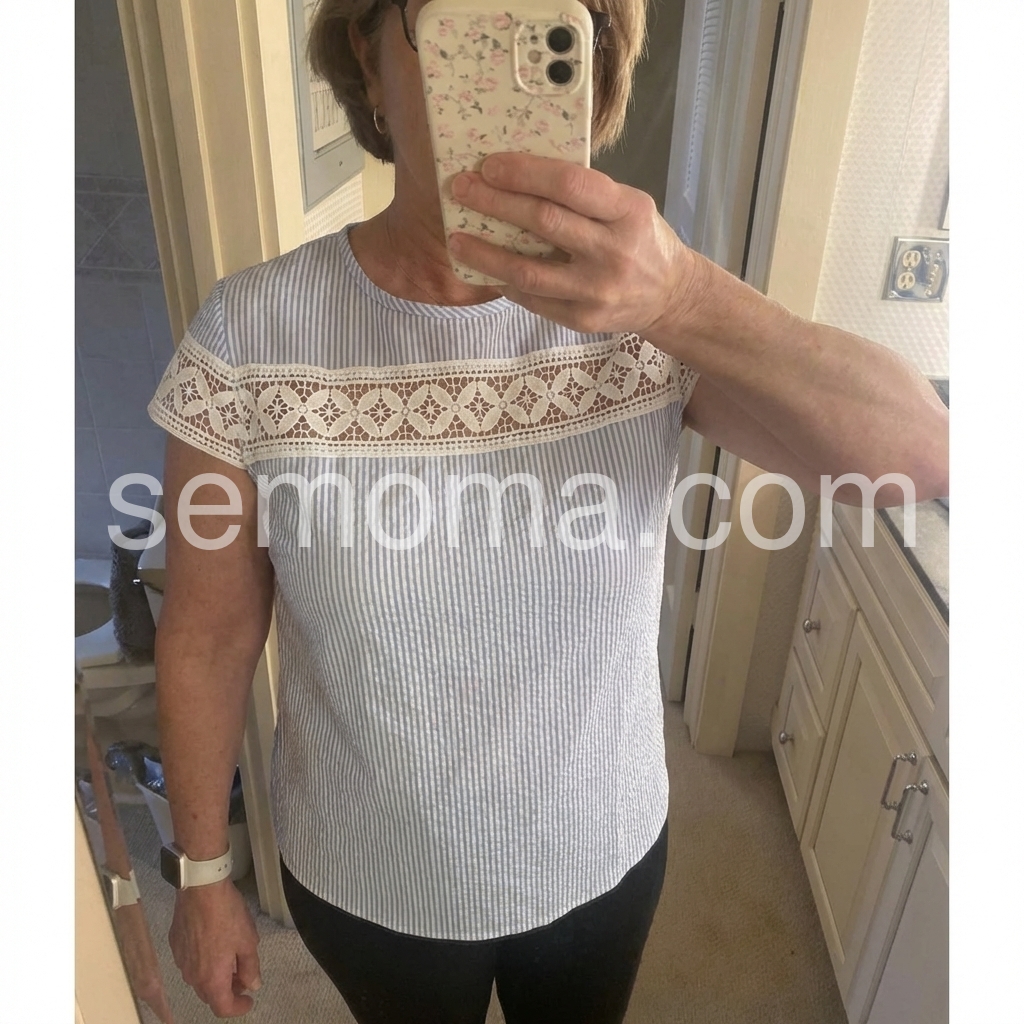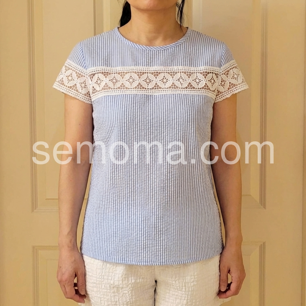 This short-sleeve top features a delicate white lace panel across the chest and sleeves. Made from soft, textured fabric with vertical stripes for a subtle pattern. Perfect for casual summer days or beach outings. Pair with shorts or jeans for a stylish look. Effortlessly chic and breathable.