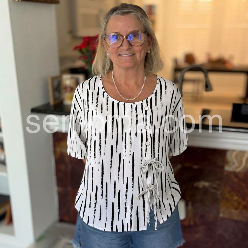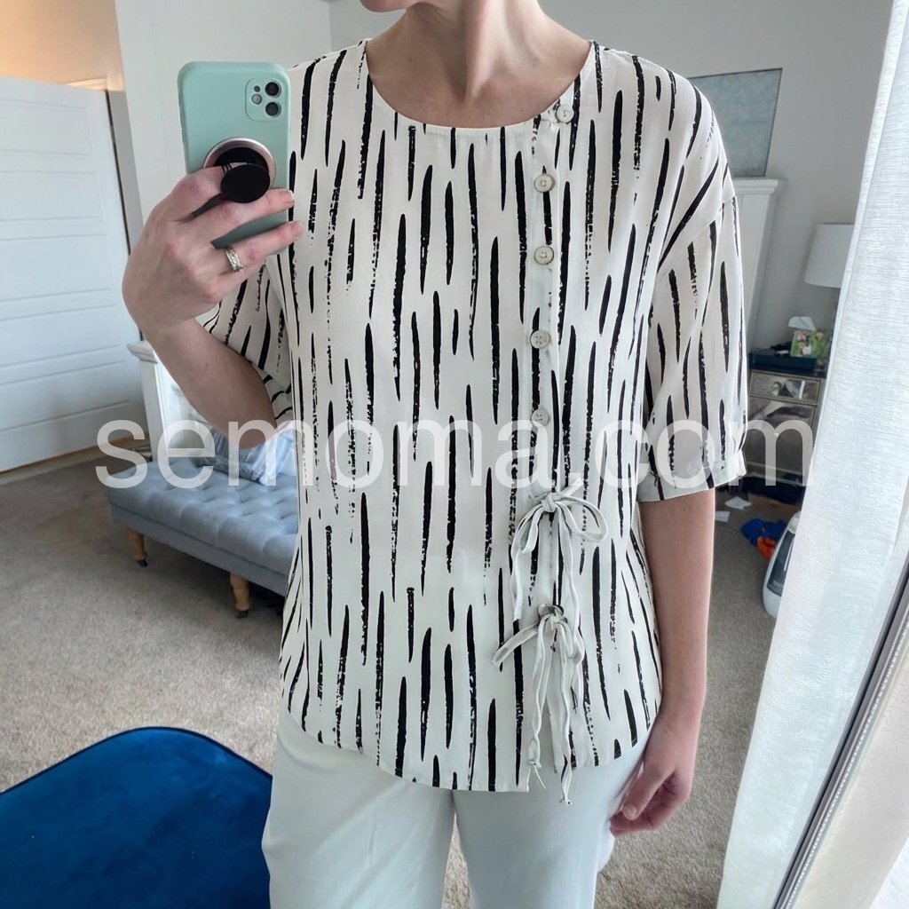This relaxed-fit blouse features a bold black abstract stripe print on a white base. Round neckline with front button closure and side tie details. Lightweight fabric perfect for everyday wear. Ideal for pairing with jeans or leggings.