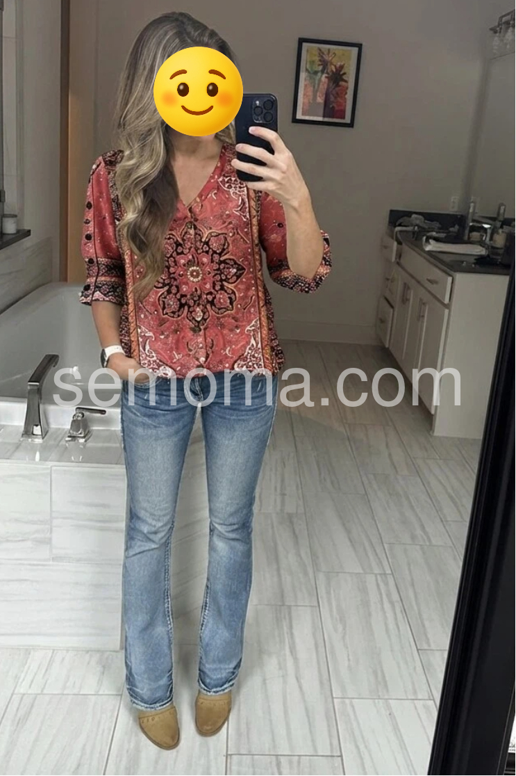 This V-neck top features a vibrant red base with an intricate mandala-inspired pattern. Button-down front and three-quarter sleeves with button cuffs add detail. Lightweight fabric for comfort and ease. Perfect for adding a bohemian flair to any outfit. Effortlessly stylish and eye-catching.