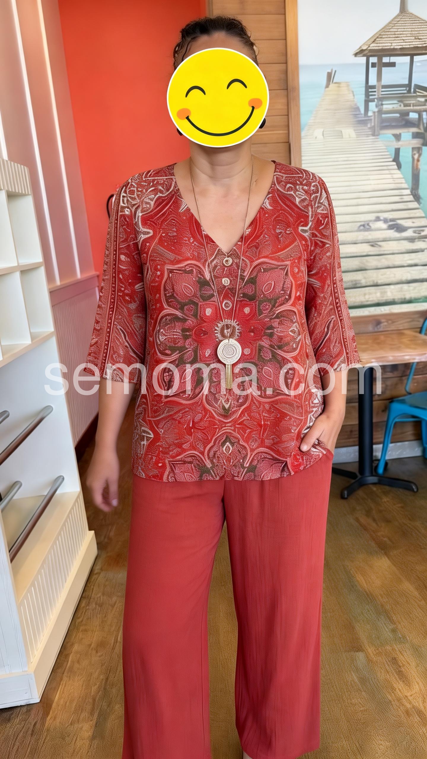This coordinated set features a V-neck top with a bold mandala print and matching solid wide-leg pants. The relaxed fit ensures all-day comfort. Soft fabric perfect for warm weather. Ideal for casual outings or stylish days out. Effortlessly chic with a bohemian flair.