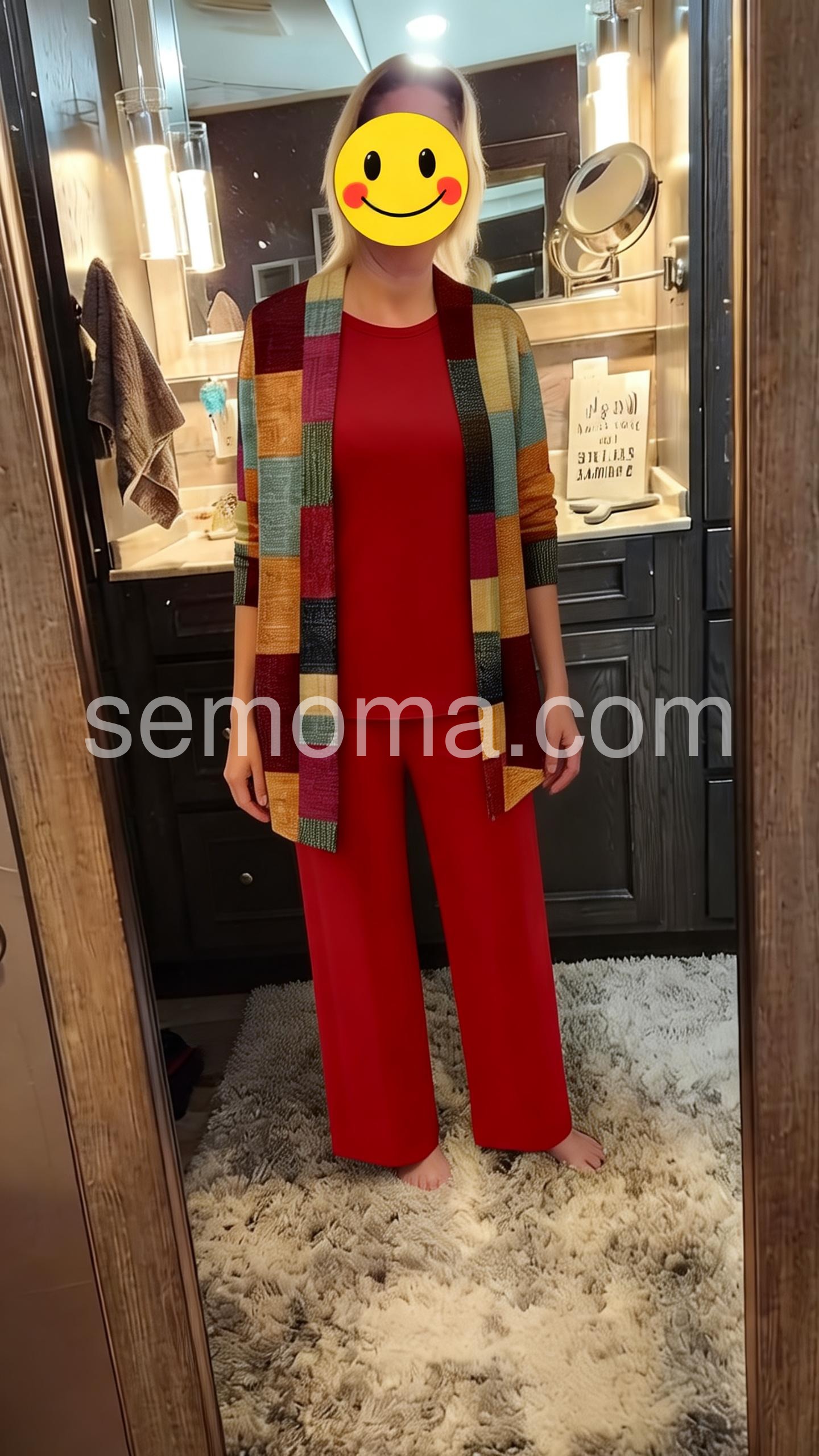 This coordinated outfit features a solid red top and wide-leg pants paired with a vibrant patchwork cardigan. The colorful, geometric design adds a modern touch. Comfortable and chic for casual or semi-formal wear. Perfect for autumn days or stylish outings. Effortlessly elegant with a pop of personality.