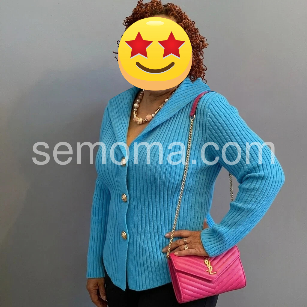I absolutely love this sweater! The bright turquoise color is perfect for adding a fun touch to my outfits, and the ribbed knit is so soft and warm. The asymmetrical buttons are such a unique design element, and the slim fit is really flattering. It’s easy to dress up with a skirt or dress down with jeans, making it a versatile staple. The fabric is high quality and holds its shape well. Definitely worth buying!