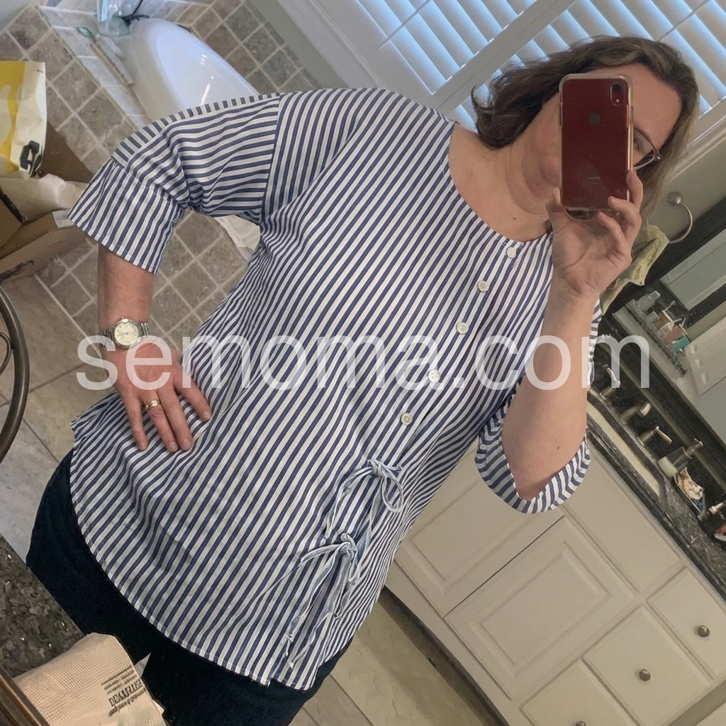 This loose-fit top features vertical blue and white stripes with a clean, casual look. Round neckline and front button-down design for easy wear. Side ties add a feminine touch. Three-quarter sleeves with rolled cuffs. Perfect for everyday comfort and effortless style.