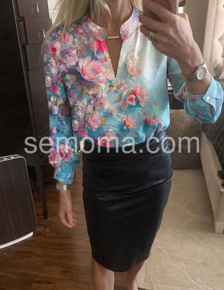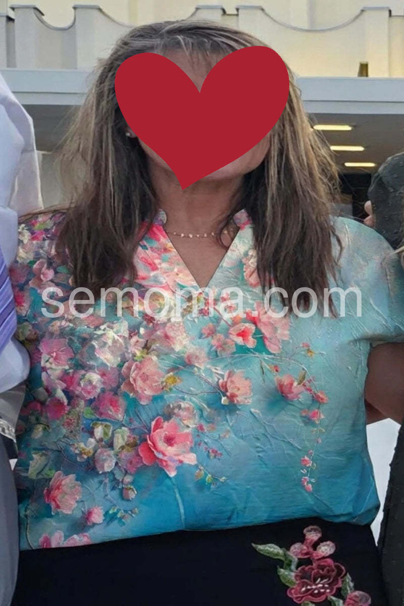 Bring a burst of elegance to your wardrobe with this Fresh Turquoise Floral Print Top, a stunning piece that blends vibrant floral artistry with luxurious fabric. Crafted from a smooth, satin-like material—likely silk or satin blend—this blouse features a rich turquoise base adorned with a lush watercolor-inspired floral pattern in soft pinks, coral, white, and hints of green. The bold yet romantic design creates a dreamy, garden-fresh look perfect for warm weather. A subtle V-neckline adds a touch of sophistication, while the long sleeves with buttoned cuffs offer versatility and a polished finish. The relaxed, slightly flowy silhouette drapes beautifully over the body, making it ideal for pairing with jeans, tailored pants, or high-waisted skirts. Styled here with denim and layered jewelry, it effortlessly balances casual comfort with refined style. Whether you're heading to a daytime event, brunch, or a summer outing, this floral blouse brings grace, color, and timeless charm to every look.