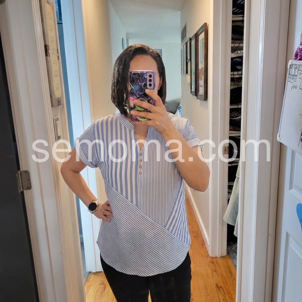 This short-sleeve top features vertical blue and white stripes. V-neckline with front buttons and a stylish wrap design. Cuffed sleeves add a polished touch. Lightweight and perfect for casual wear. Ideal paired with jeans or trousers.