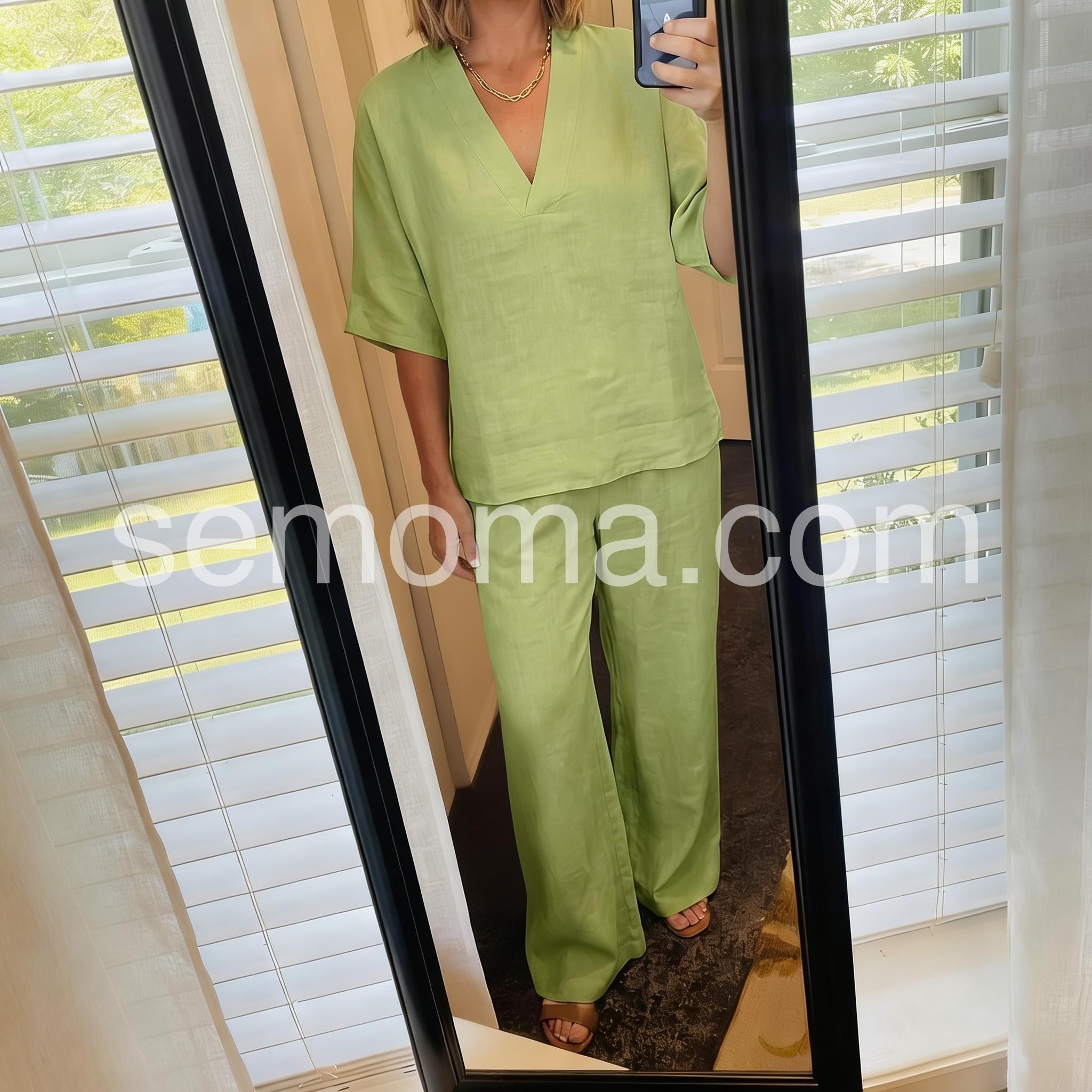 This coordinated set features a relaxed V-neck top and wide-leg pants in soft, breathable linen. The solid lime green hue offers a fresh, natural look. Perfect for warm weather and casual wear. Ideal for beach days or effortless everyday style. Comfortable and elegantly simple.