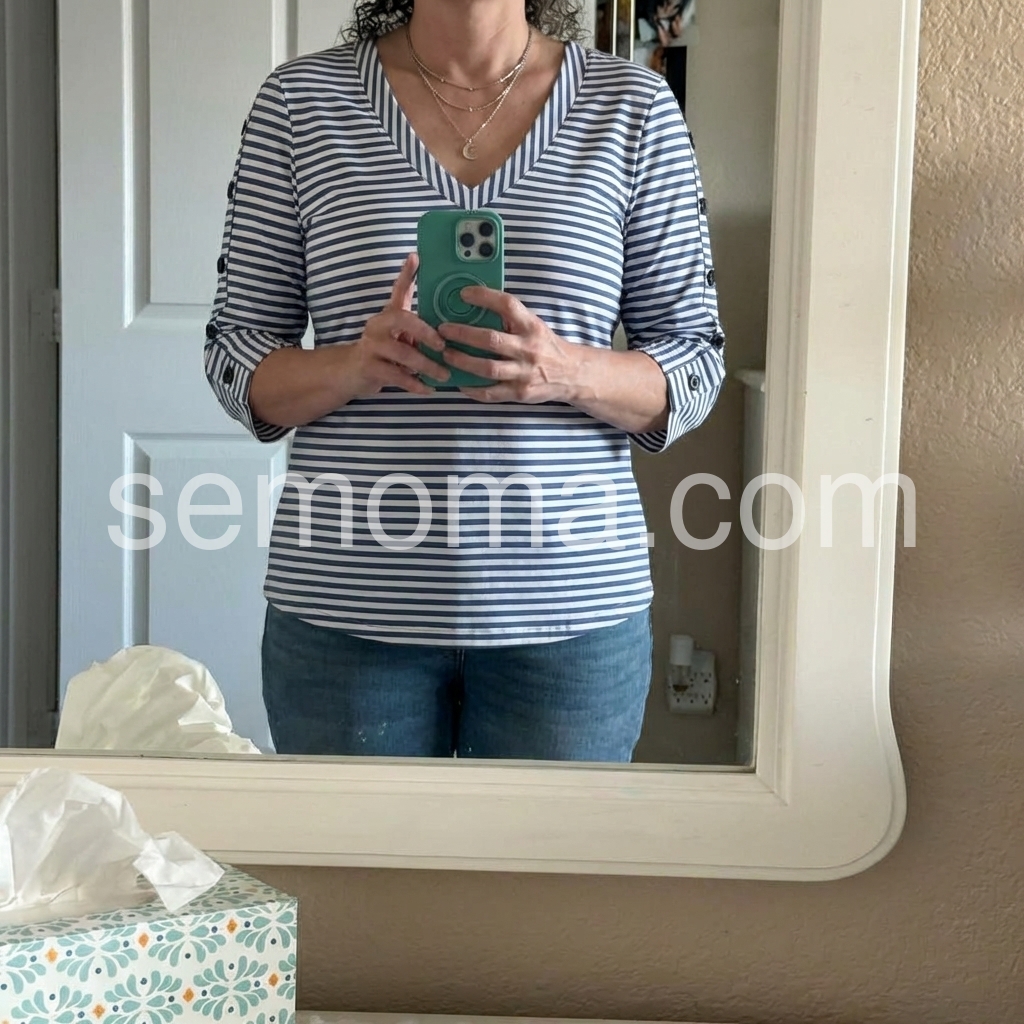 As a fashion editor, I love how this top reimagines the classic stripe with modern flair. The deep V-neck flatters every face shape, while the three-quarter sleeves with button accents solve the common issue of “boring basics” by adding subtle visual interest.