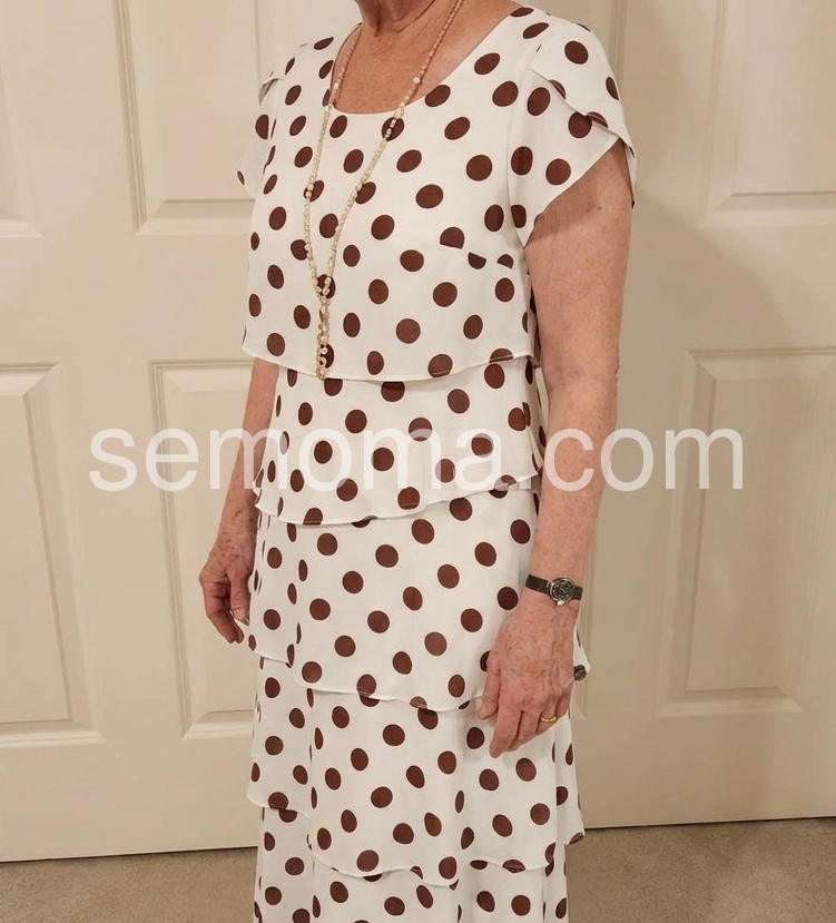 This tiered dress reimagines polka dots with modern flair. The large brown dots on a creamy base feel retro yet fresh, while the tiered ruffle skirt adds soft movement and volume. The relaxed fit skims over hips and thighs, making it comfortable for all-day wear.