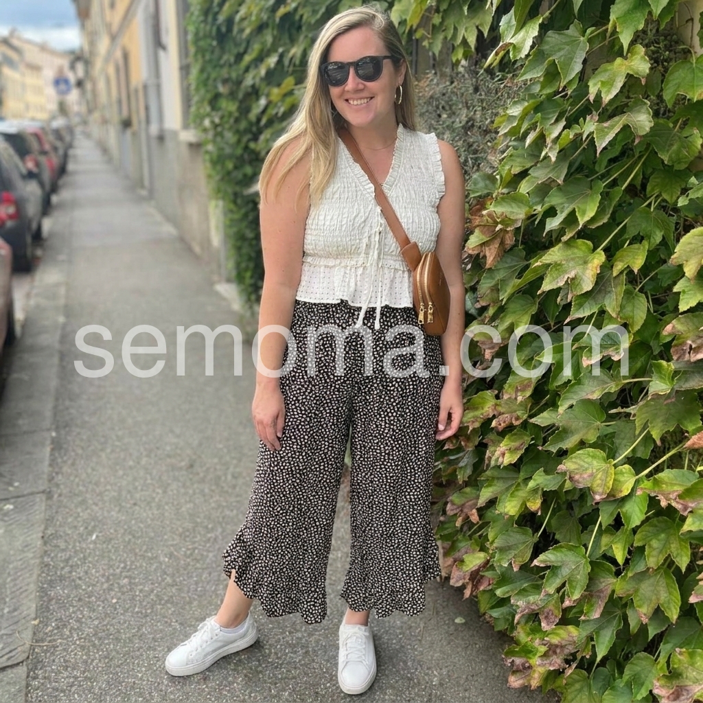 These high-waisted culottes feature a delicate white floral print on black. Wide-leg design with ruffled hem for a soft, feminine touch. Lightweight fabric perfect for warm weather. Ideal for casual wear or relaxed outings. Stylish and comfortable.