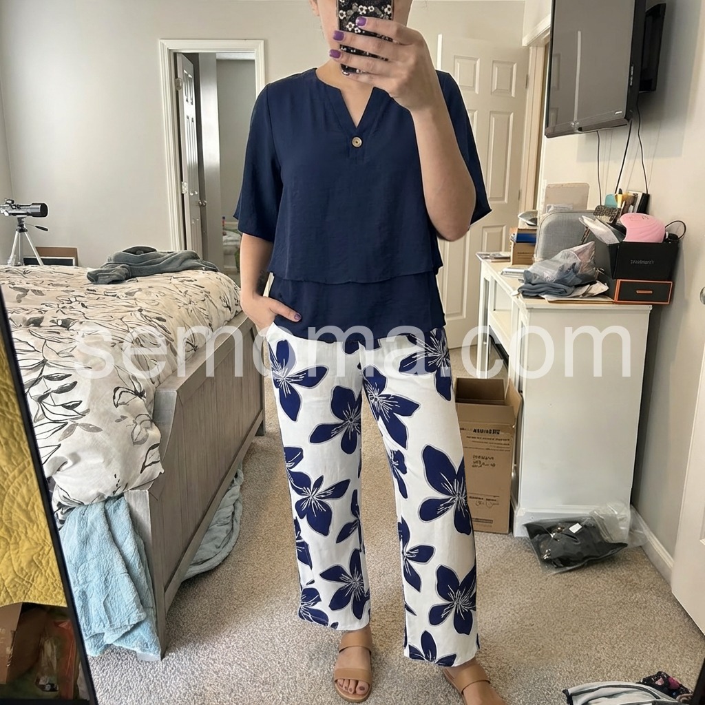 This coordinated set features a relaxed navy top with a layered hem and a single-button detail. Paired with white pants in bold navy floral prints for a beach-ready look. Lightweight fabric perfect for warm weather. Ideal for resort wear or casual outings. Effortlessly elegant and easy to style.