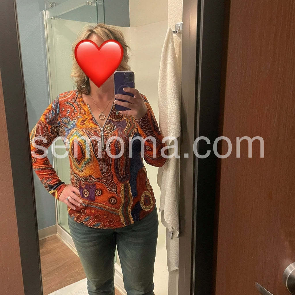 This shirt hides all my flaws while still giving me a nice shape. The V-neck elongates the neck, and the busy pattern is very forgiving. It's super comfy and stylish!